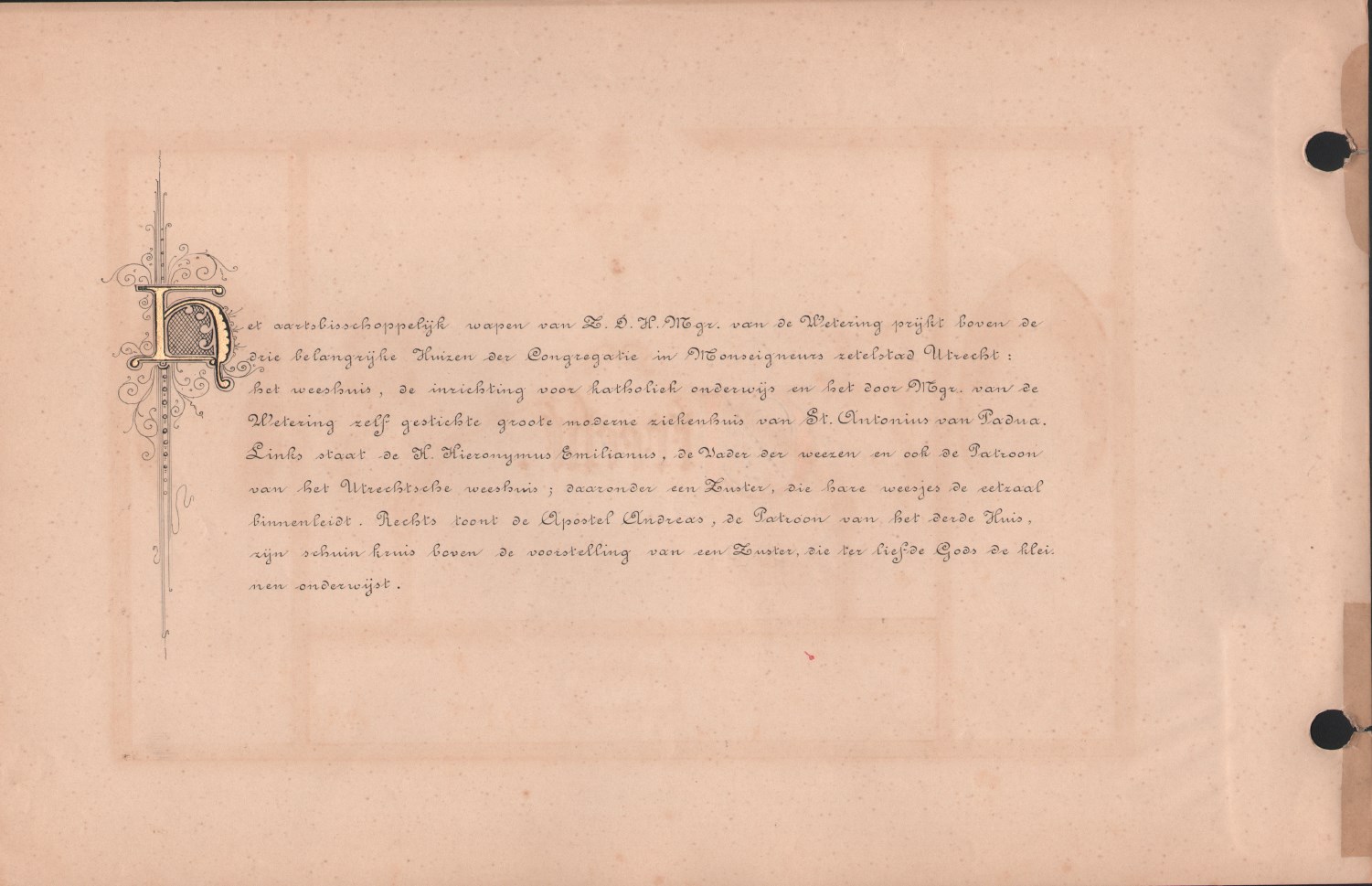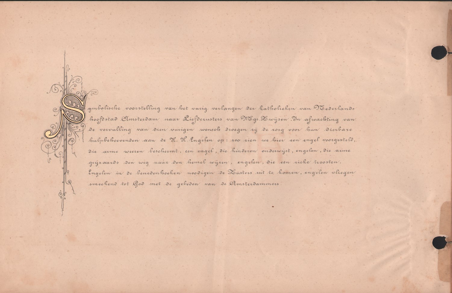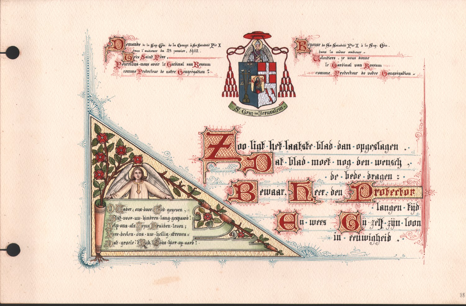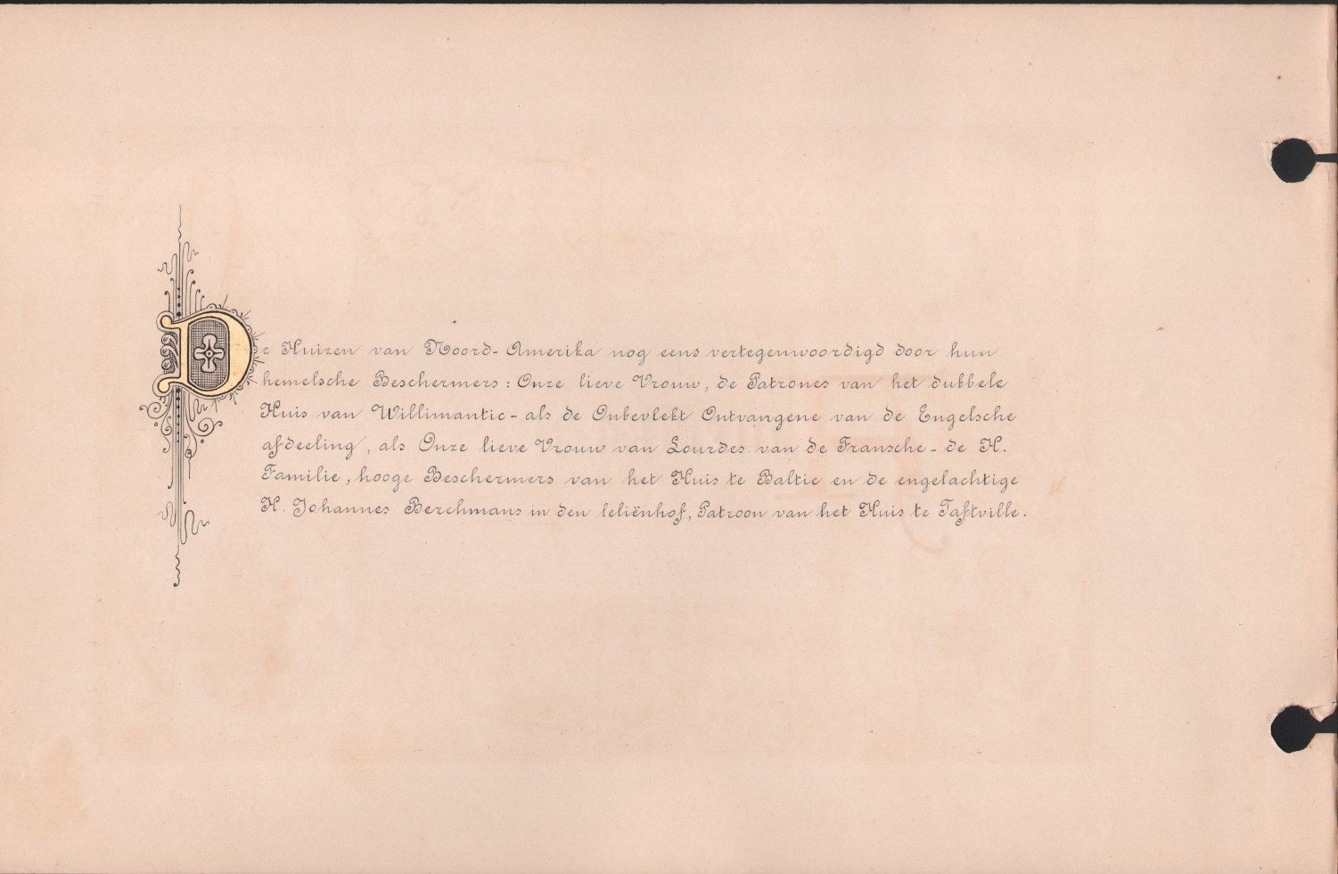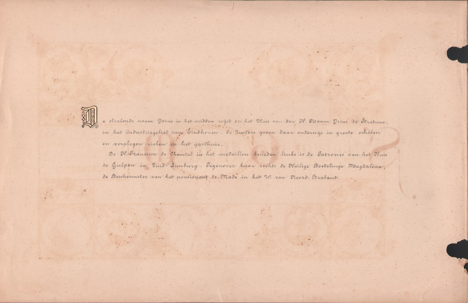 Album met tekeningen stichtingen congregatie van zusters van Liefde aangeboden aan Van Rossum. Band van Indisch weefsel met gouddraad. 1r: blanco 1v: blanco 2r: Blad met rijkversierde letters met de tekst: Aan Zijne Eminentie Kardinaal W.M. van Rossum onzen hoogvereerden Protector op het Gouden Jubelfeest van Zijne Professie in de Congregatie van den Allerheiligsten Verlosser ...