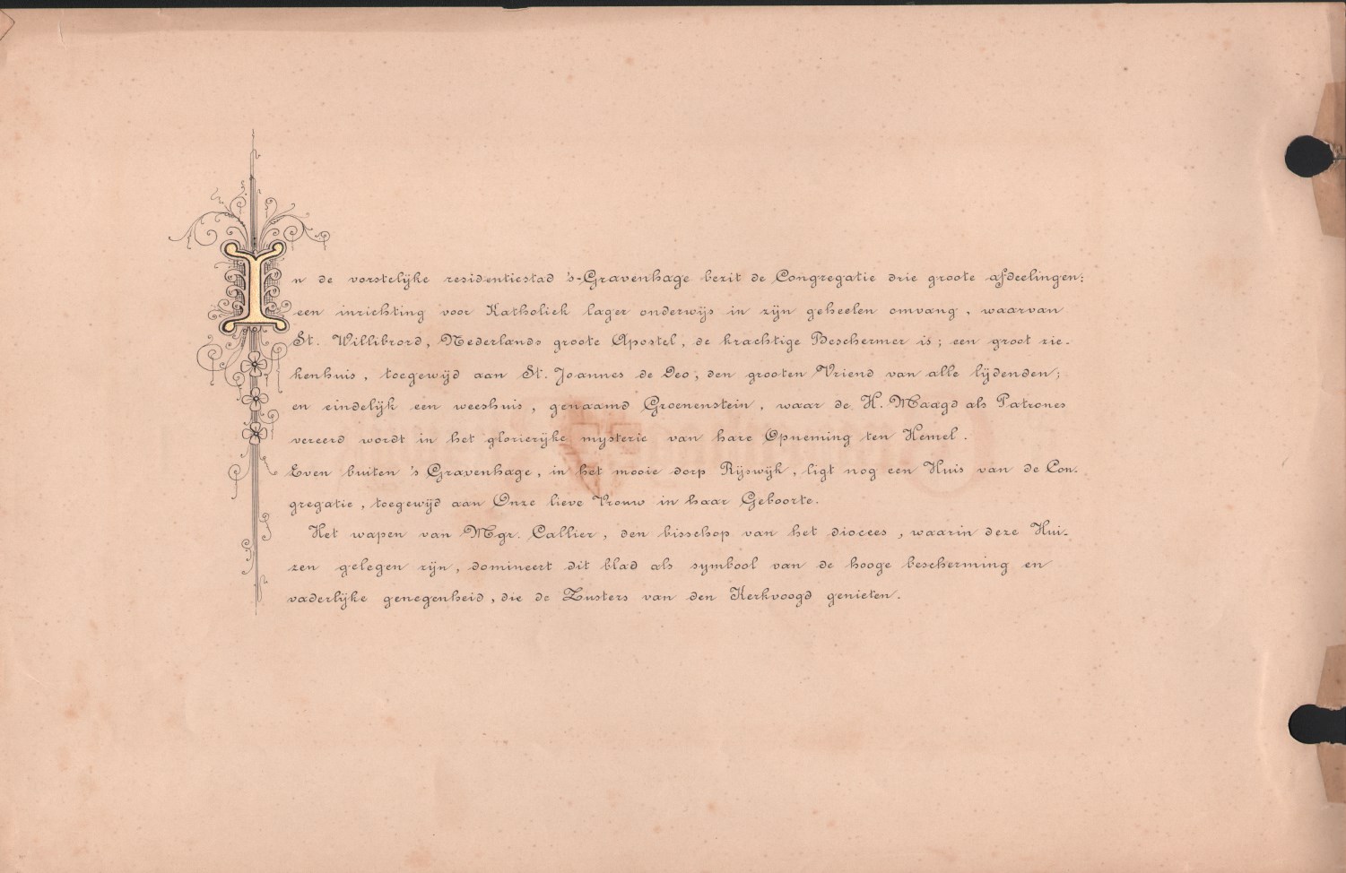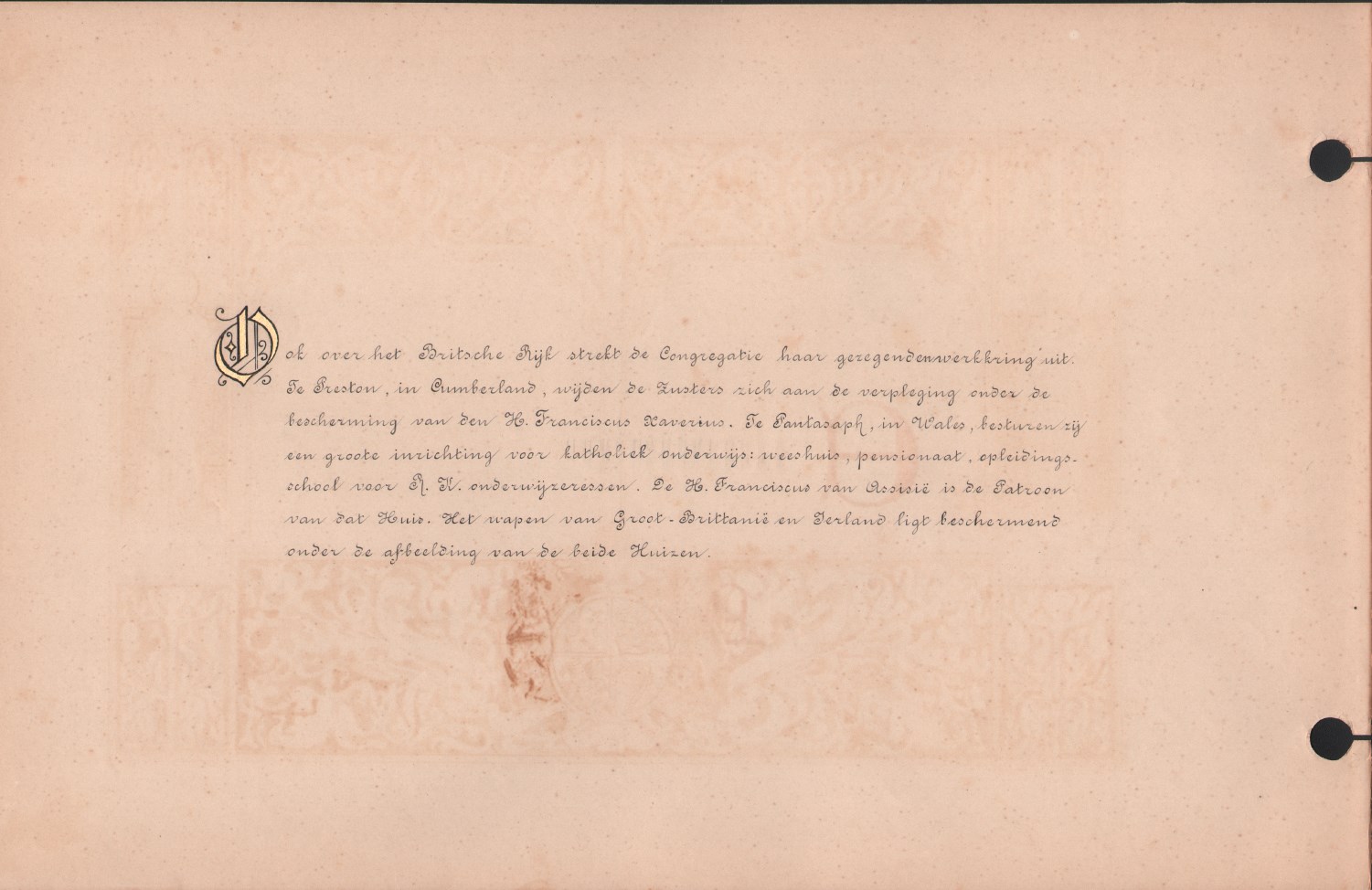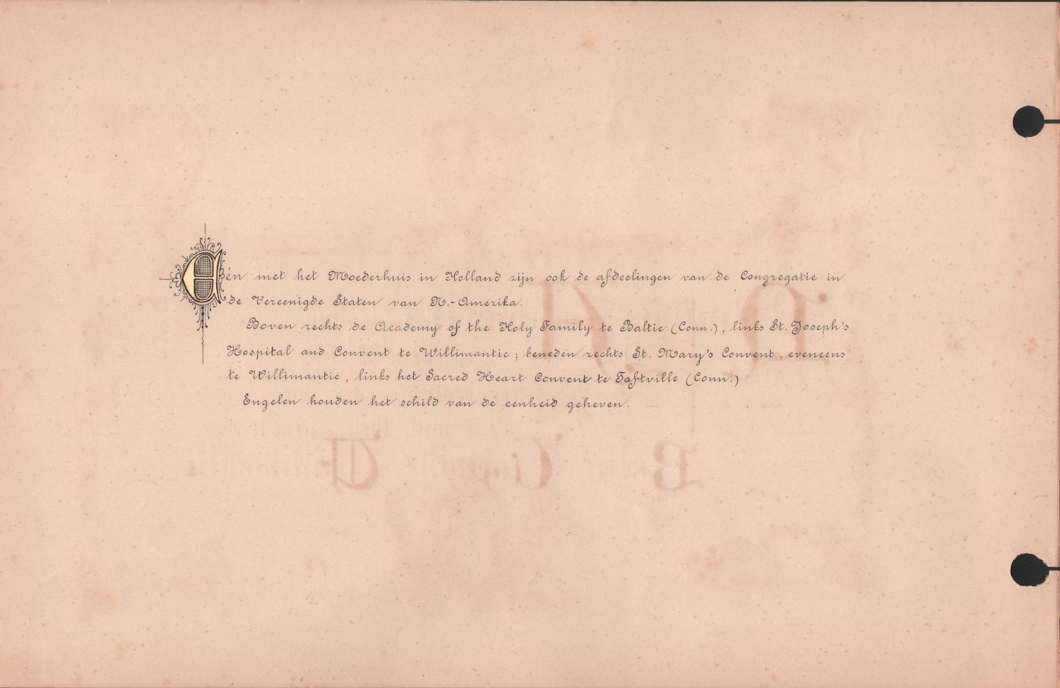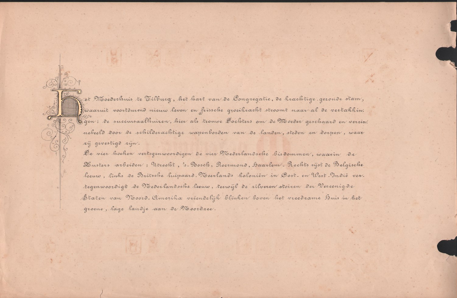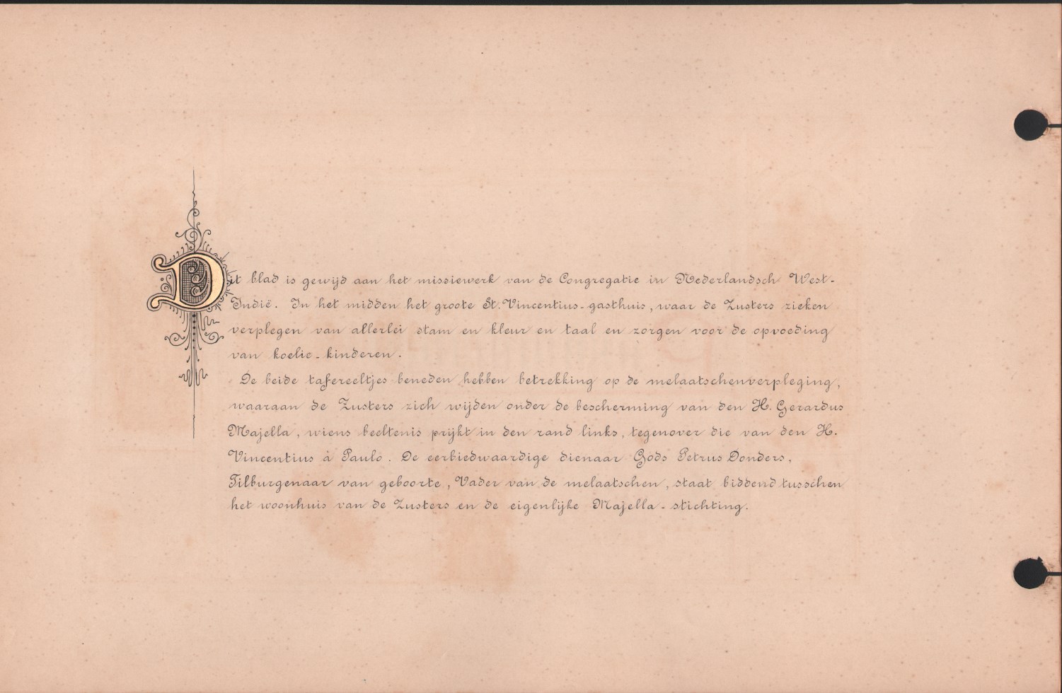 Album met tekeningen stichtingen congregatie van zusters van Liefde aangeboden aan Van Rossum. Band van Indisch weefsel met gouddraad. 1r: blanco 1v: blanco 2r: Blad met rijkversierde letters met de tekst: Aan Zijne Eminentie Kardinaal W.M. van Rossum onzen hoogvereerden Protector op het Gouden Jubelfeest van Zijne Professie in de Congregatie van den Allerheiligsten Verlosser ...
