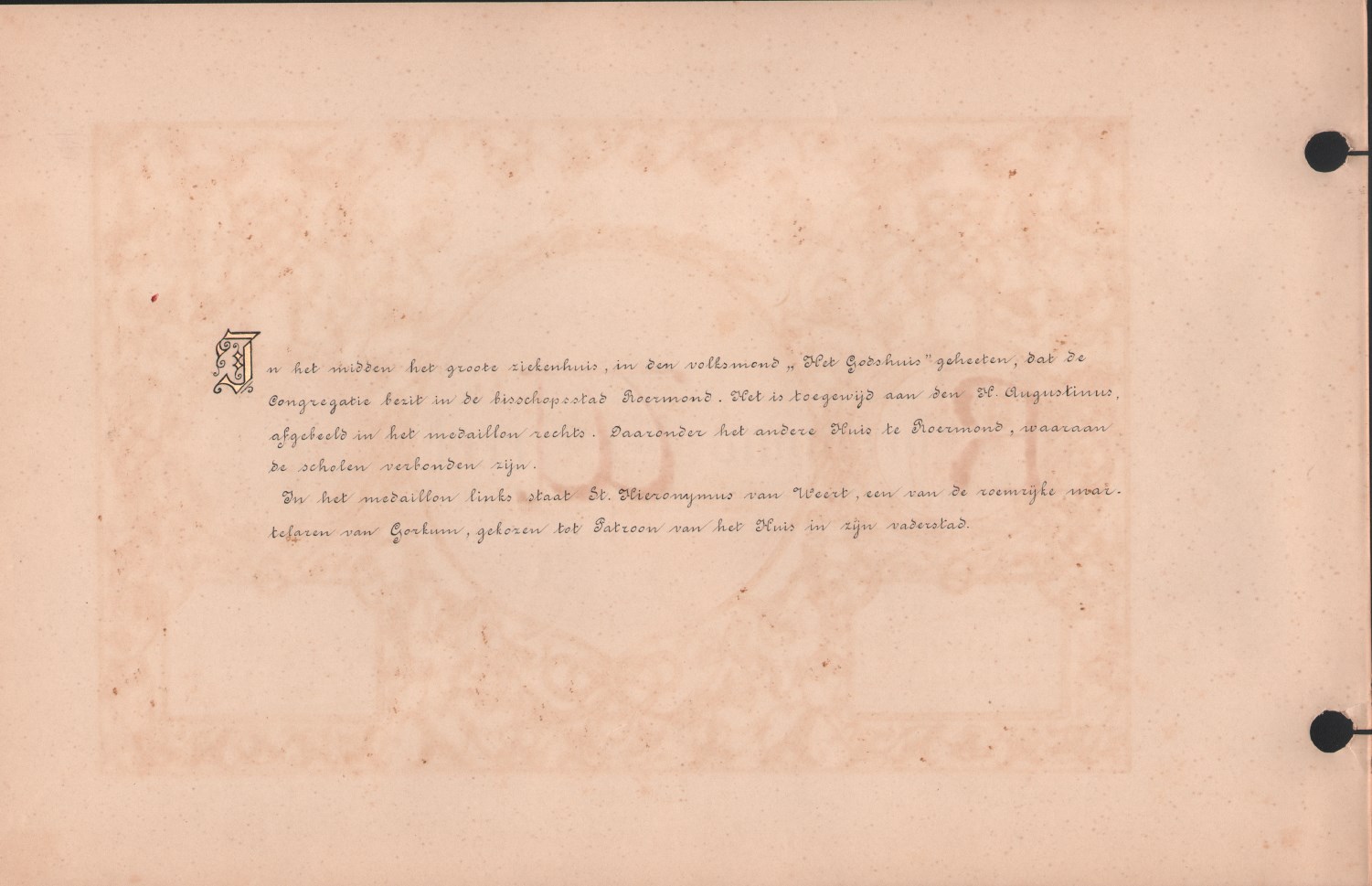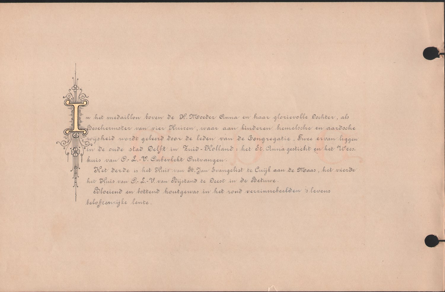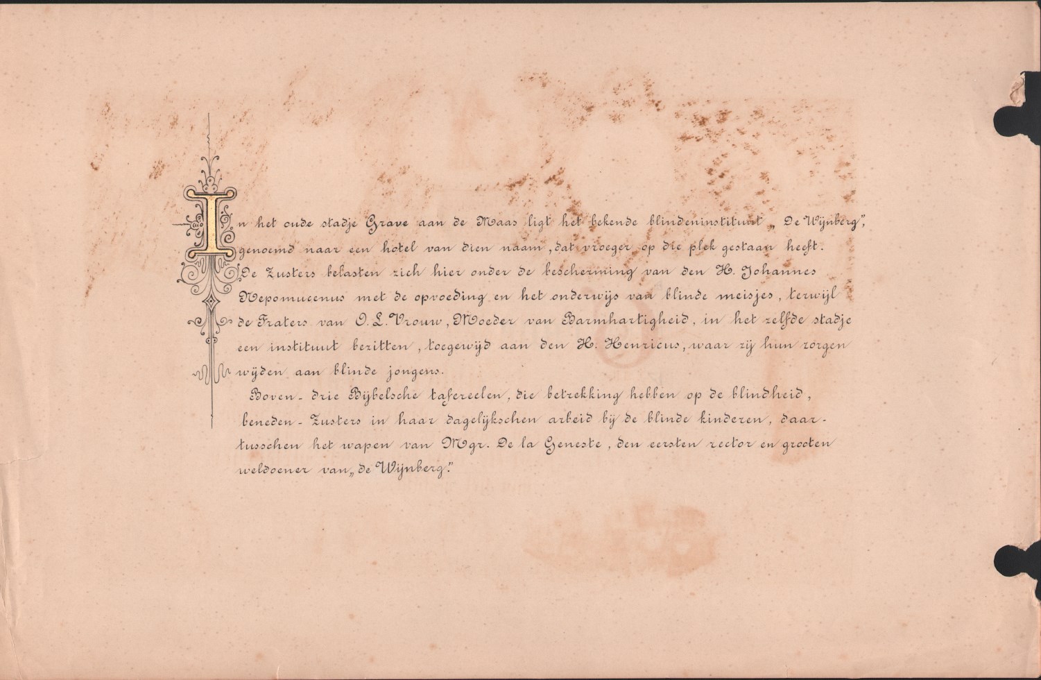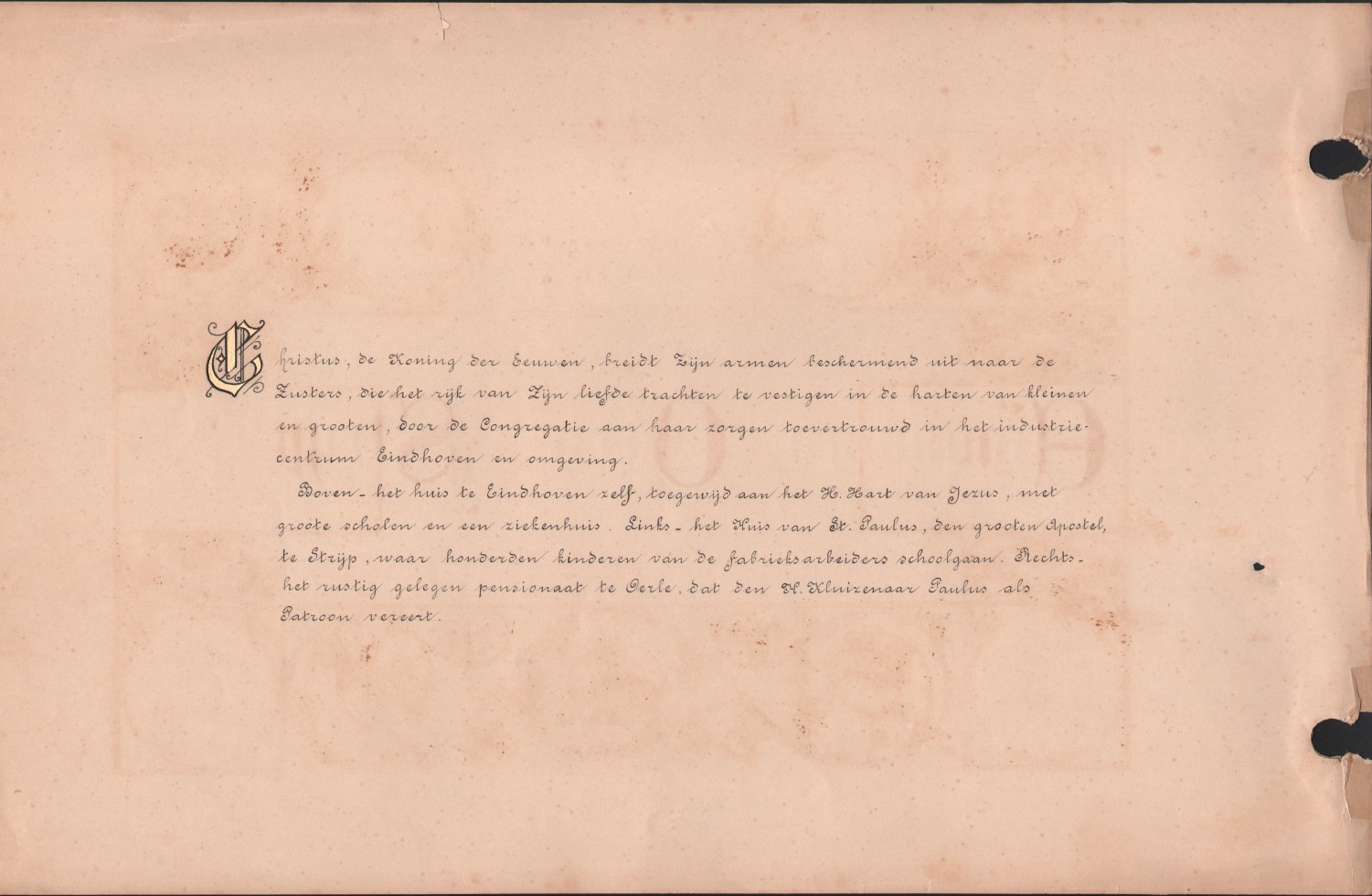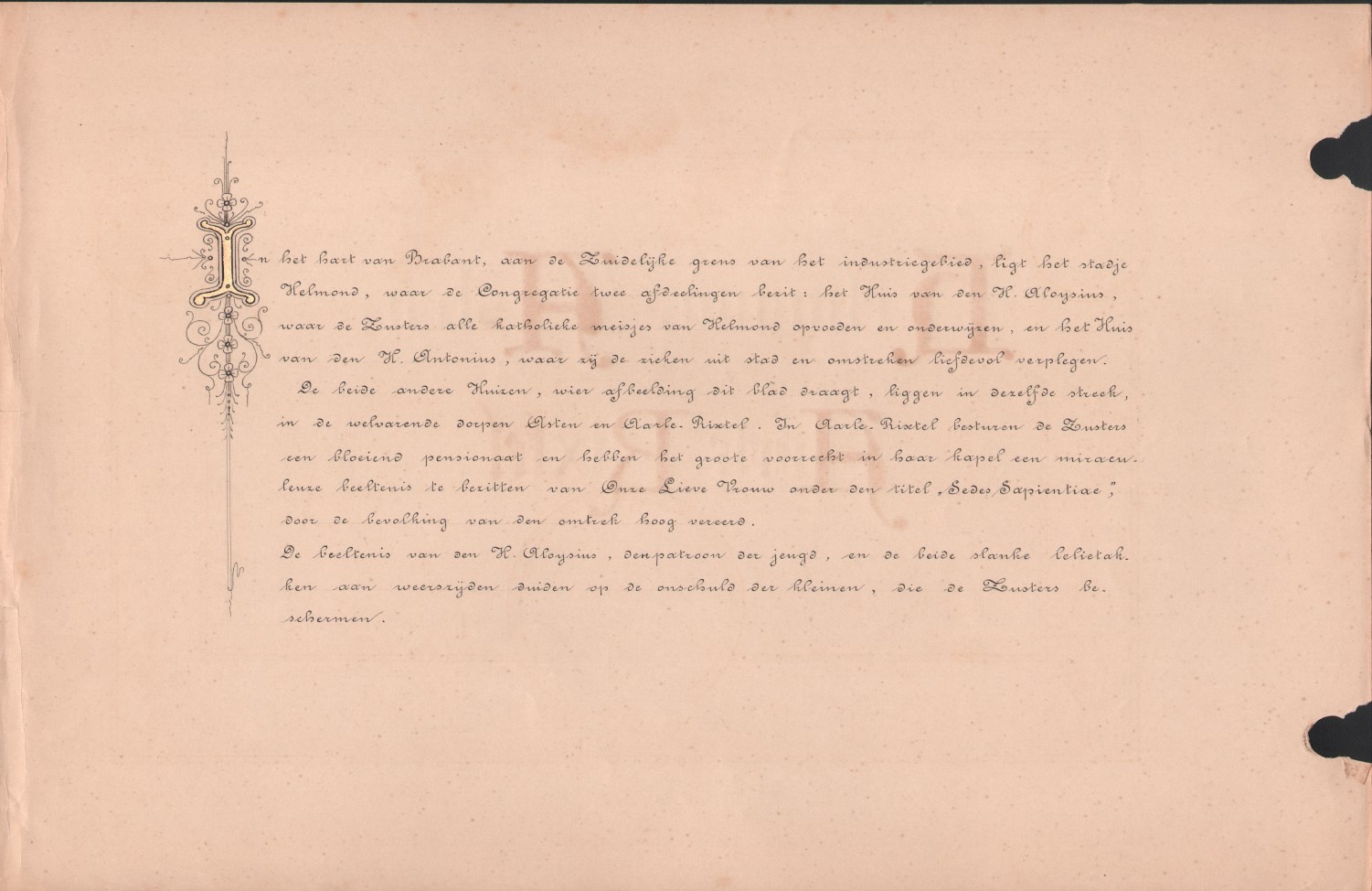 Album met tekeningen stichtingen congregatie van zusters van Liefde aangeboden aan Van Rossum. Band van Indisch weefsel met gouddraad. 1r: blanco 1v: blanco 2r: Blad met rijkversierde letters met de tekst: Aan Zijne Eminentie Kardinaal W.M. van Rossum onzen hoogvereerden Protector op het Gouden Jubelfeest van Zijne Professie in de Congregatie van den Allerheiligsten Verlosser ...