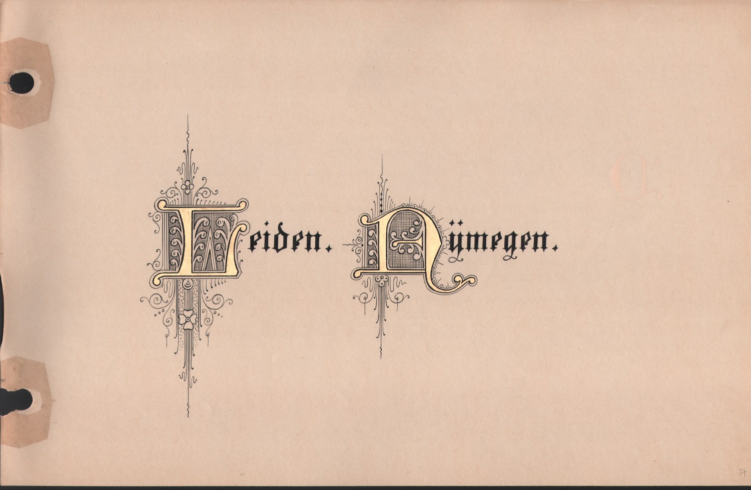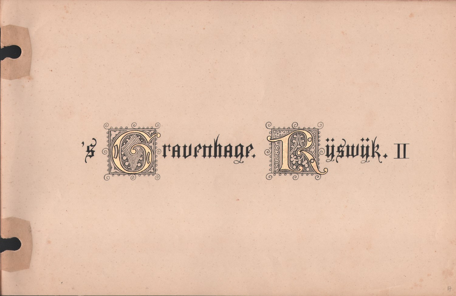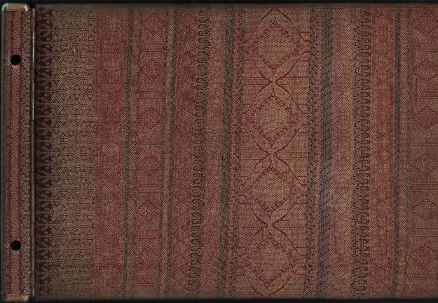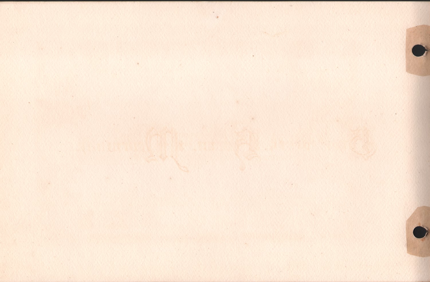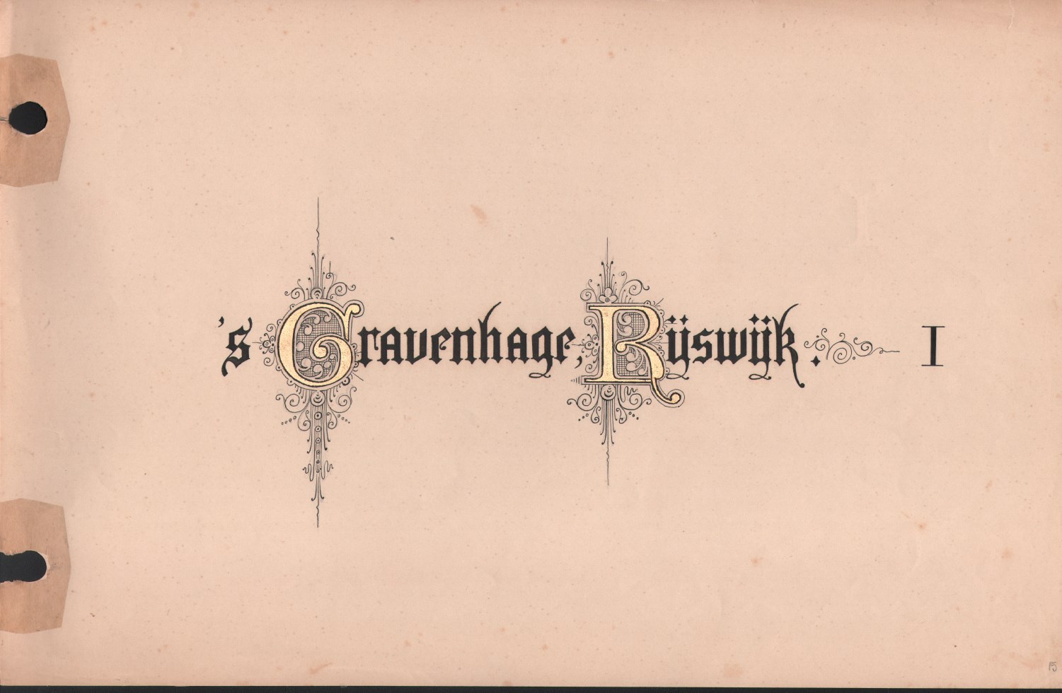 Album met tekeningen stichtingen congregatie van zusters van Liefde aangeboden aan Van Rossum. Band van Indisch weefsel met gouddraad. 1r: blanco 1v: blanco 2r: Blad met rijkversierde letters met de tekst: Aan Zijne Eminentie Kardinaal W.M. van Rossum onzen hoogvereerden Protector op het Gouden Jubelfeest van Zijne Professie in de Congregatie van den Allerheiligsten Verlosser ...