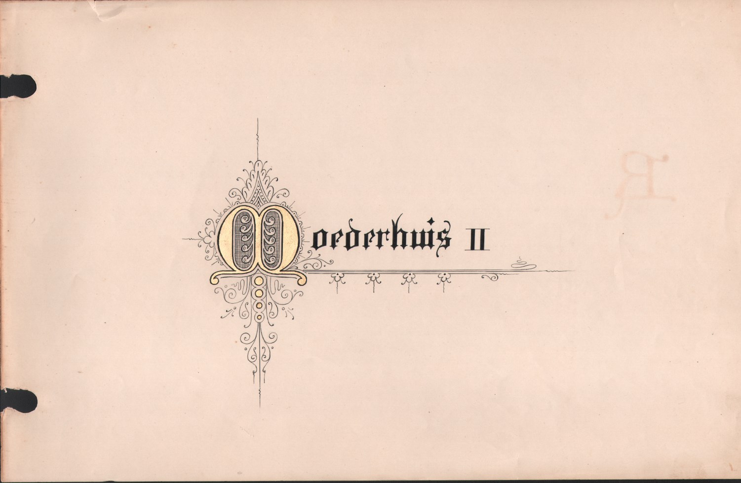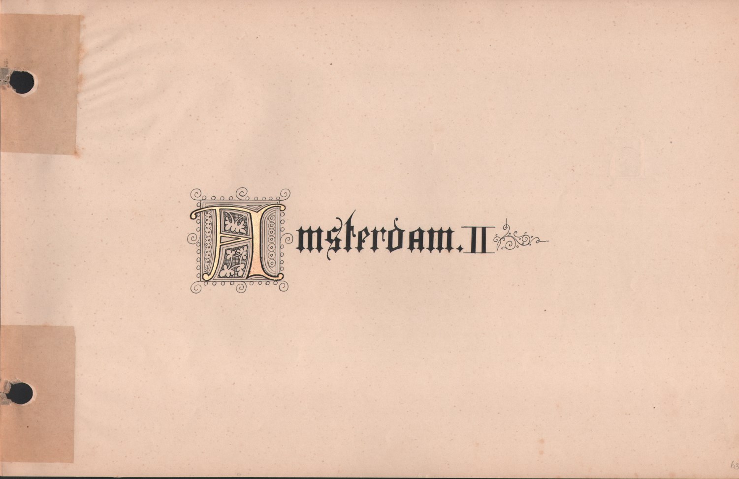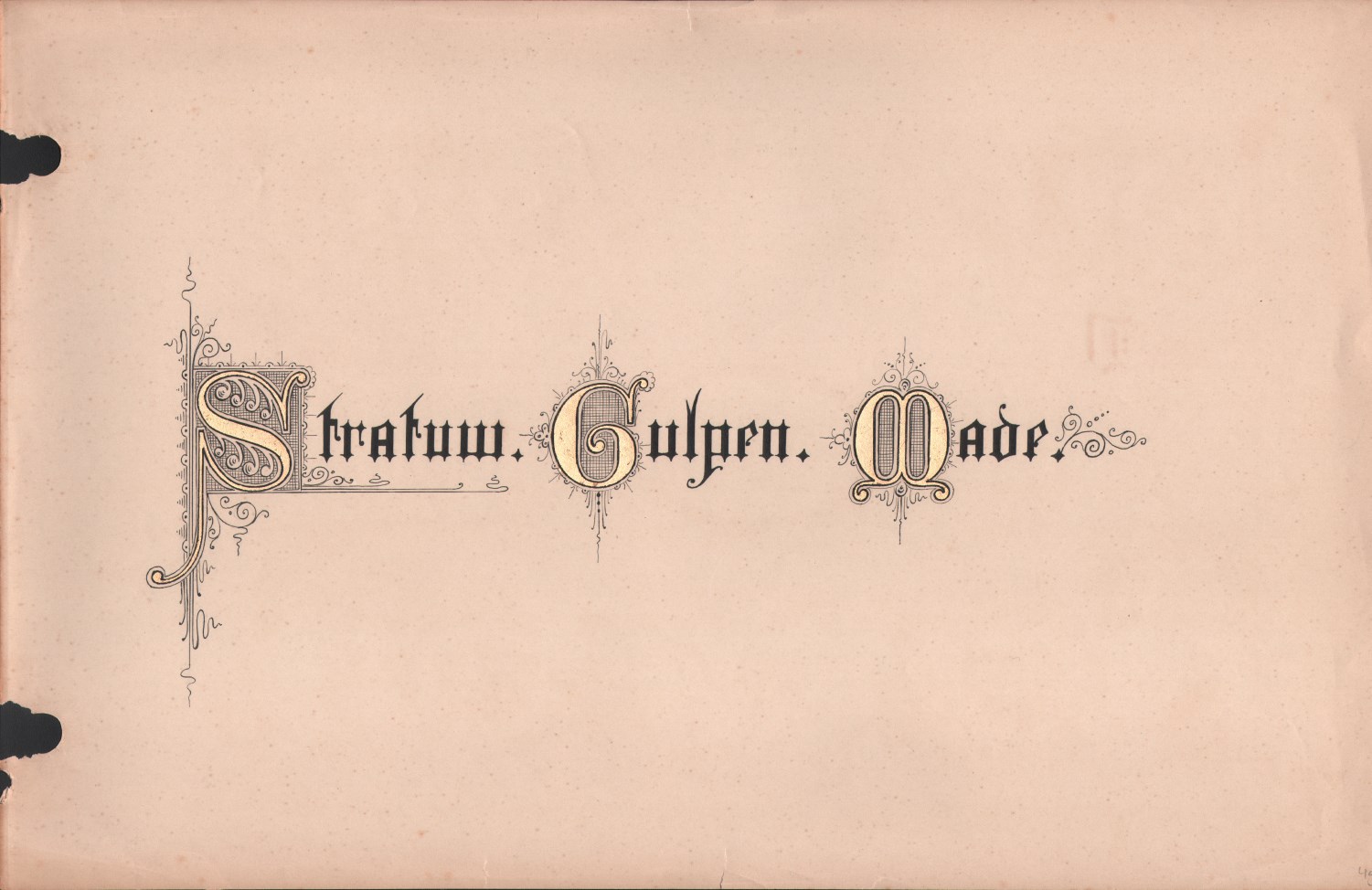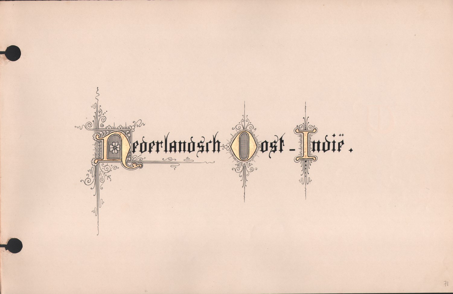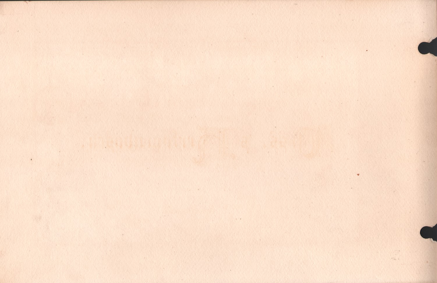 Album met tekeningen stichtingen congregatie van zusters van Liefde aangeboden aan Van Rossum. Band van Indisch weefsel met gouddraad. 1r: blanco 1v: blanco 2r: Blad met rijkversierde letters met de tekst: Aan Zijne Eminentie Kardinaal W.M. van Rossum onzen hoogvereerden Protector op het Gouden Jubelfeest van Zijne Professie in de Congregatie van den Allerheiligsten Verlosser ...