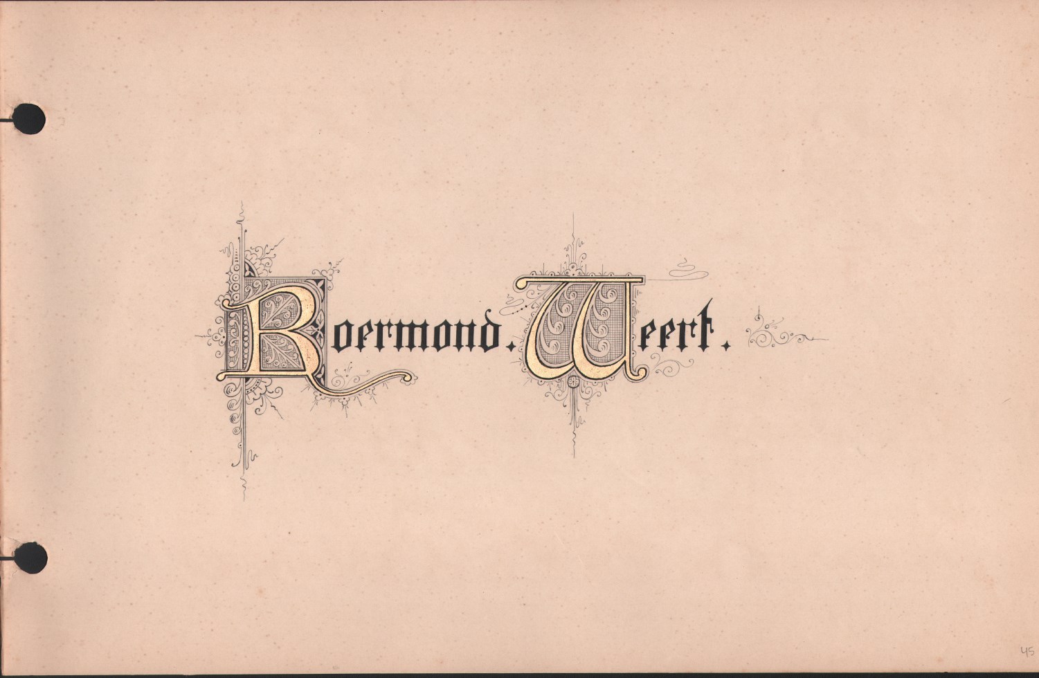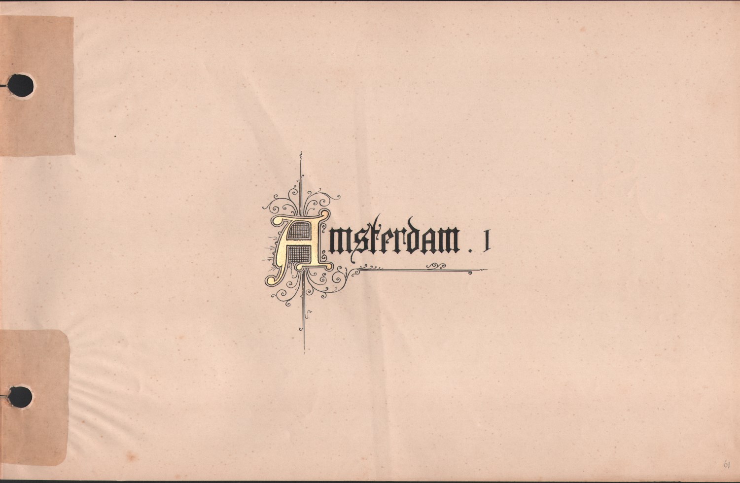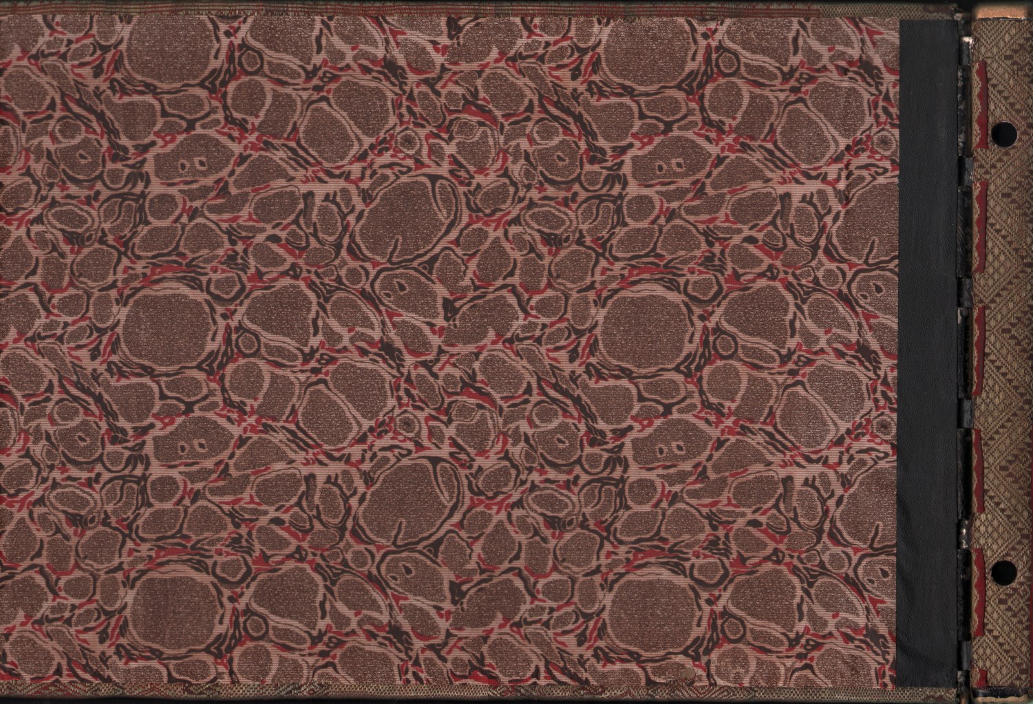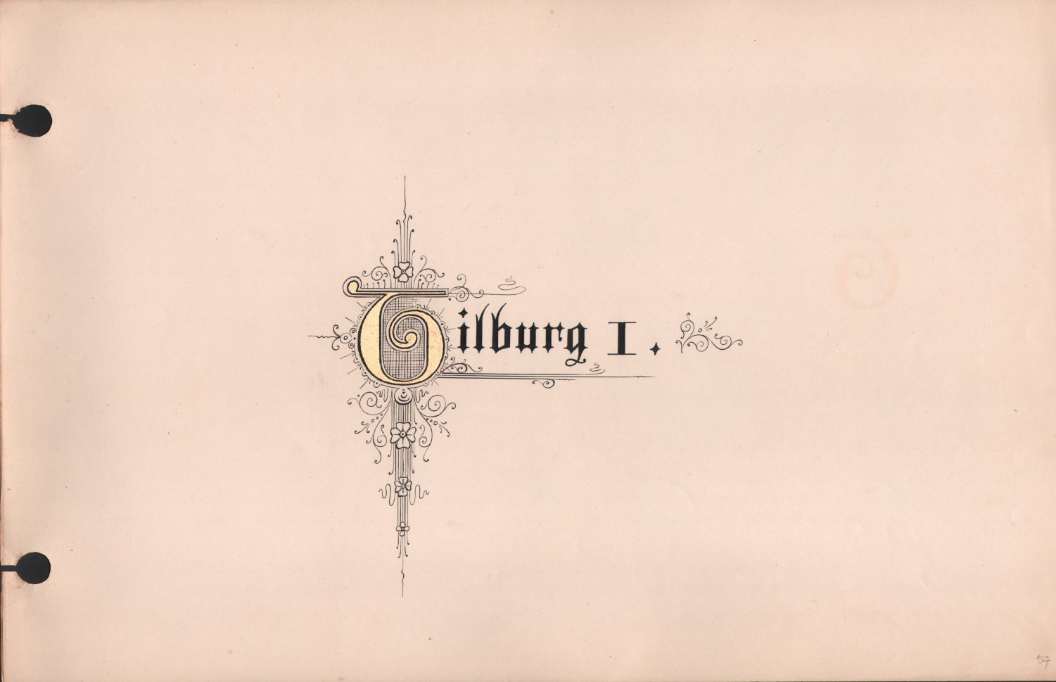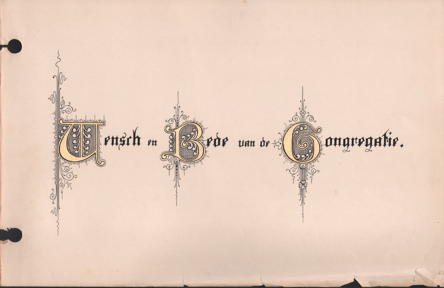 Album met tekeningen stichtingen congregatie van zusters van Liefde aangeboden aan Van Rossum. Band van Indisch weefsel met gouddraad. 1r: blanco 1v: blanco 2r: Blad met rijkversierde letters met de tekst: Aan Zijne Eminentie Kardinaal W.M. van Rossum onzen hoogvereerden Protector op het Gouden Jubelfeest van Zijne Professie in de Congregatie van den Allerheiligsten Verlosser ...