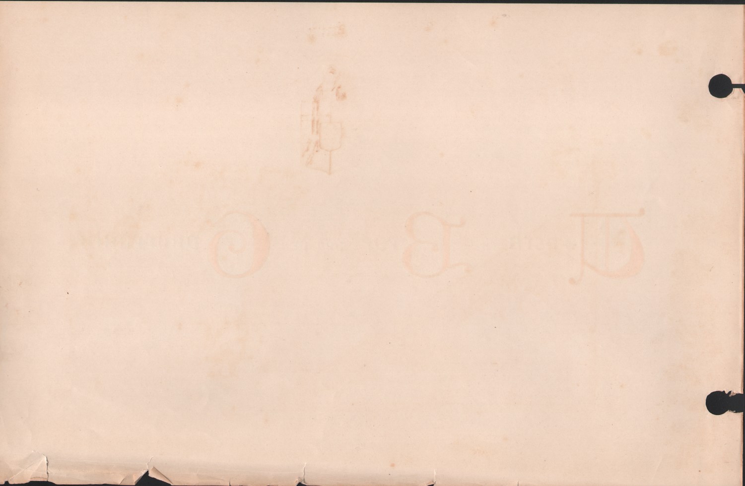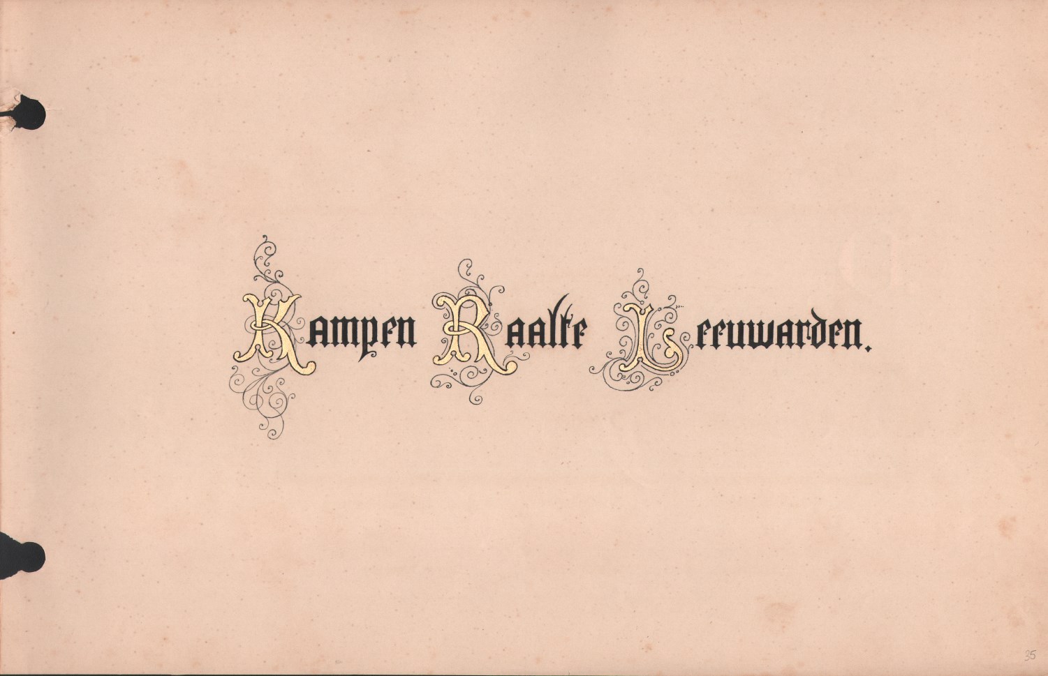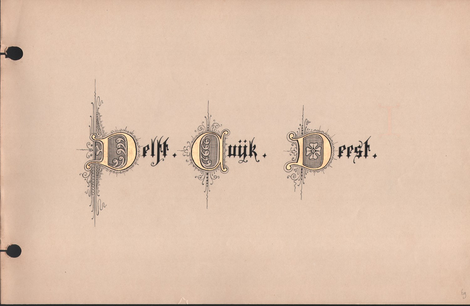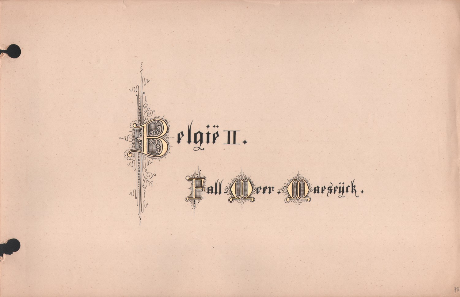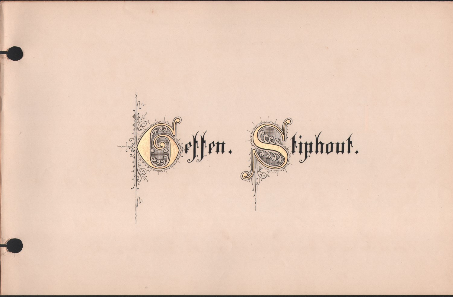 Album met tekeningen stichtingen congregatie van zusters van Liefde aangeboden aan Van Rossum. Band van Indisch weefsel met gouddraad. 1r: blanco 1v: blanco 2r: Blad met rijkversierde letters met de tekst: Aan Zijne Eminentie Kardinaal W.M. van Rossum onzen hoogvereerden Protector op het Gouden Jubelfeest van Zijne Professie in de Congregatie van den Allerheiligsten Verlosser ...