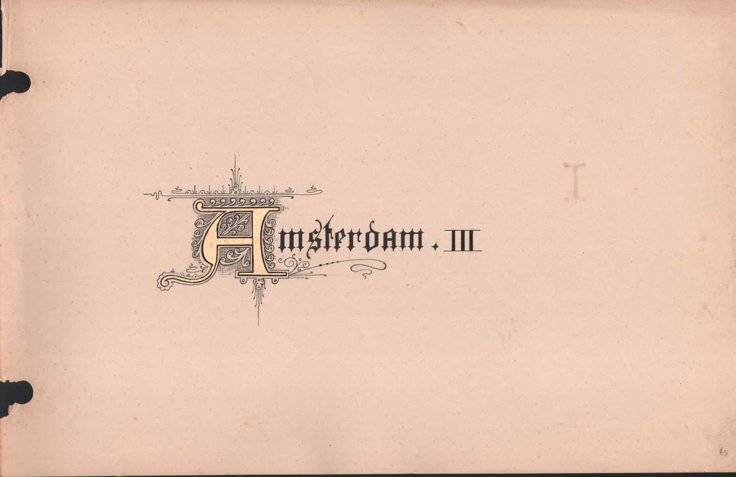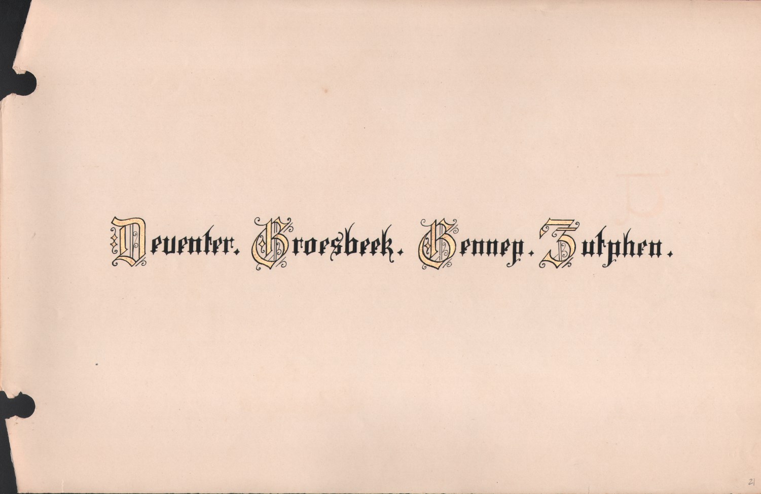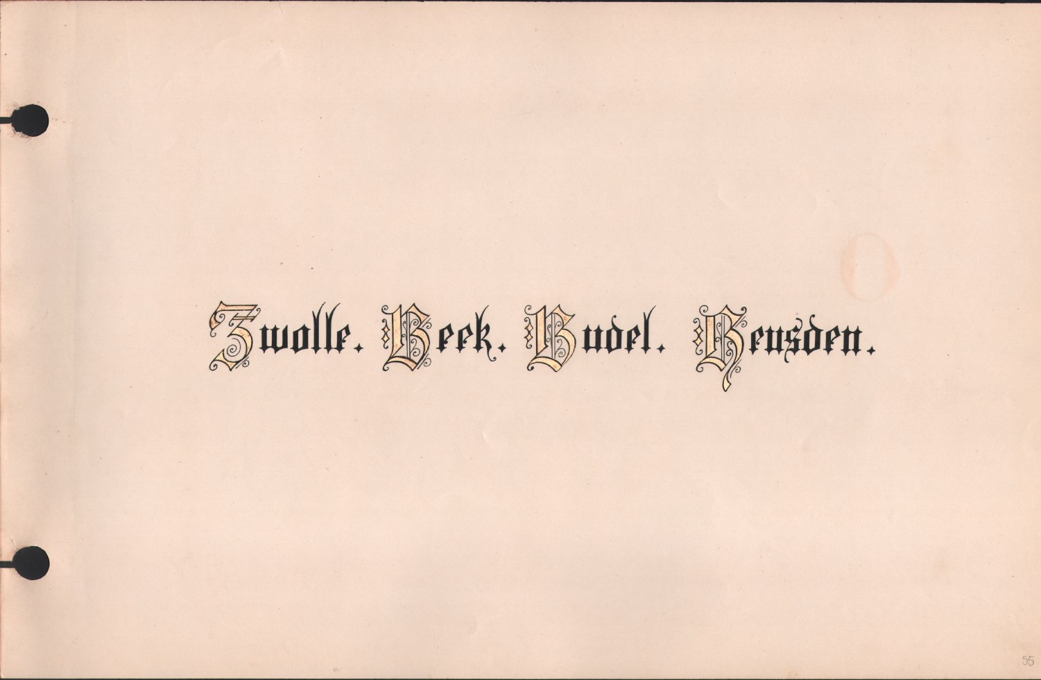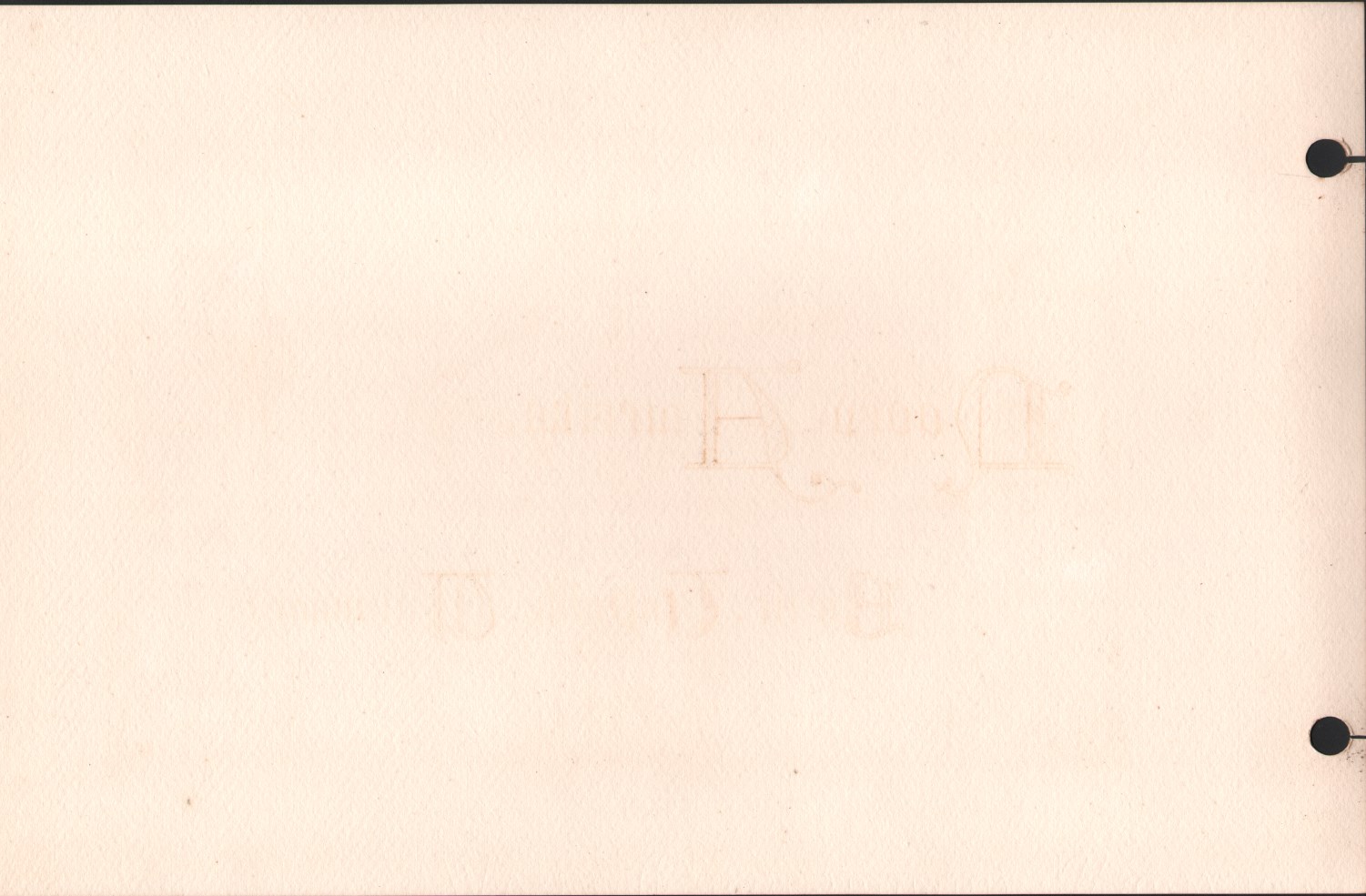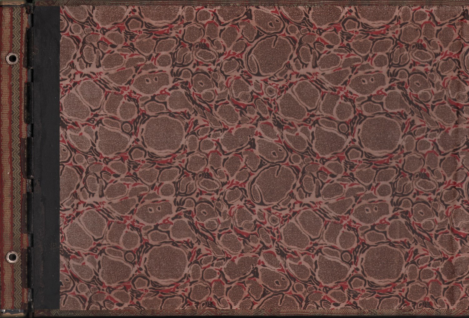 Album met tekeningen stichtingen congregatie van zusters van Liefde aangeboden aan Van Rossum. Band van Indisch weefsel met gouddraad. 1r: blanco 1v: blanco 2r: Blad met rijkversierde letters met de tekst: Aan Zijne Eminentie Kardinaal W.M. van Rossum onzen hoogvereerden Protector op het Gouden Jubelfeest van Zijne Professie in de Congregatie van den Allerheiligsten Verlosser ...
