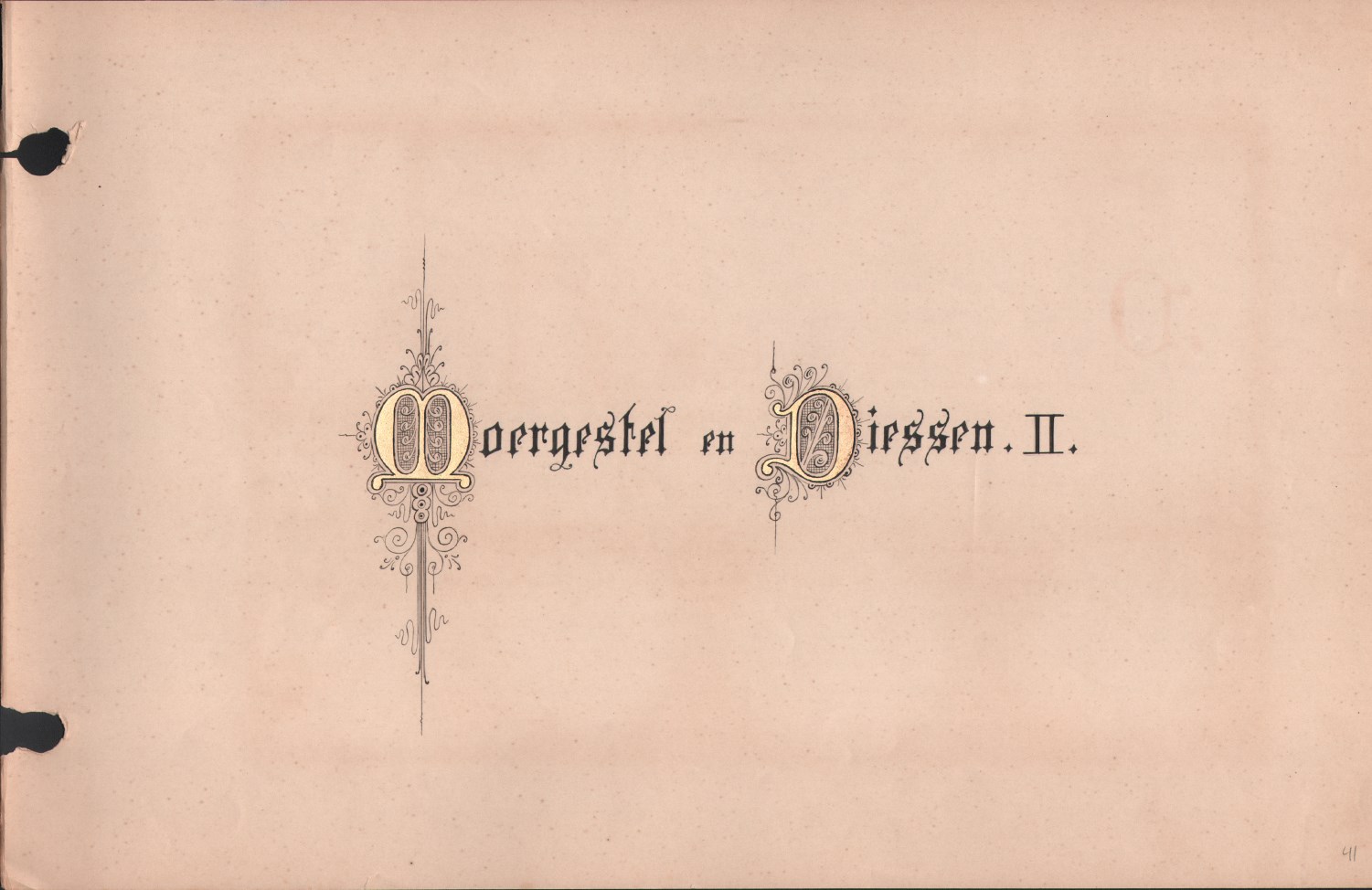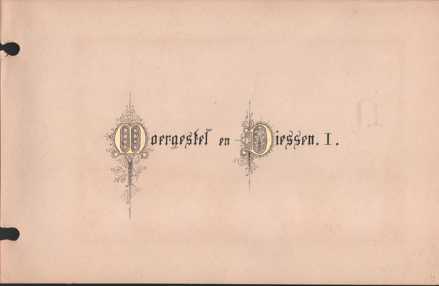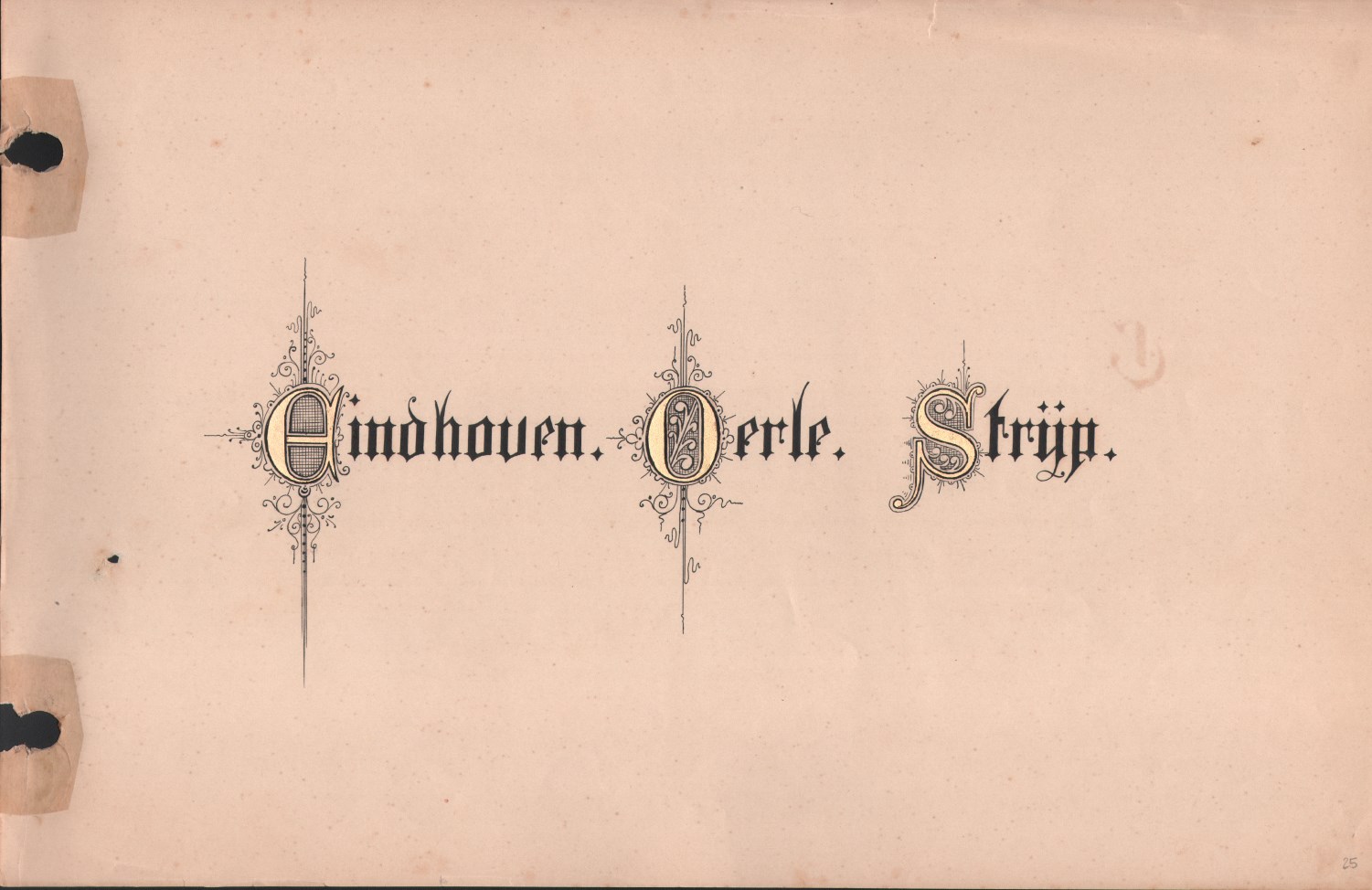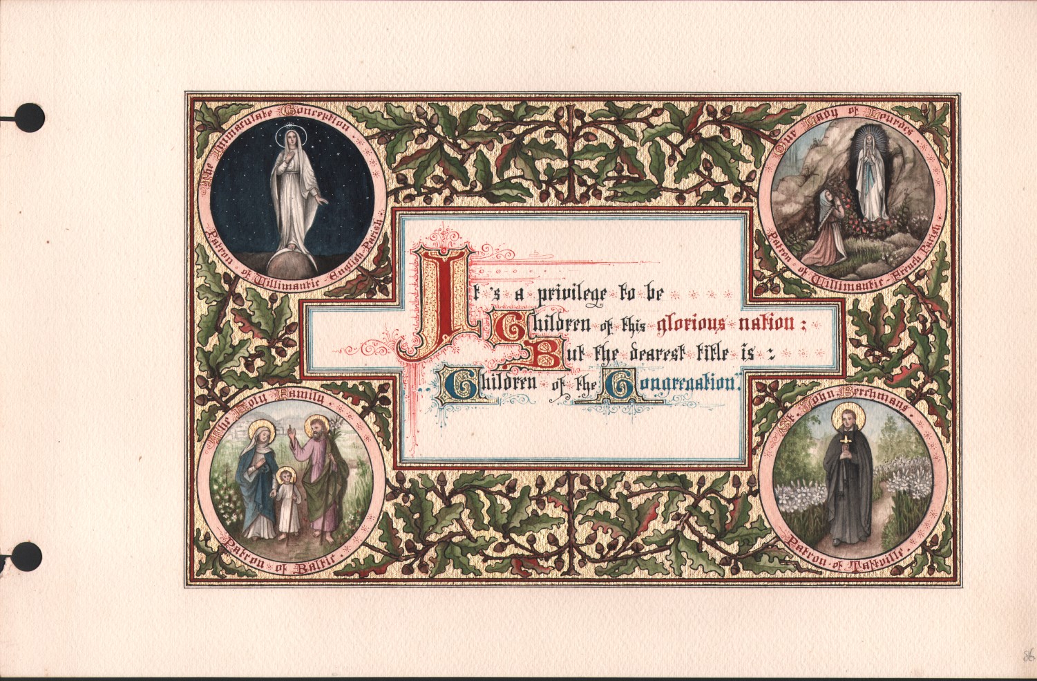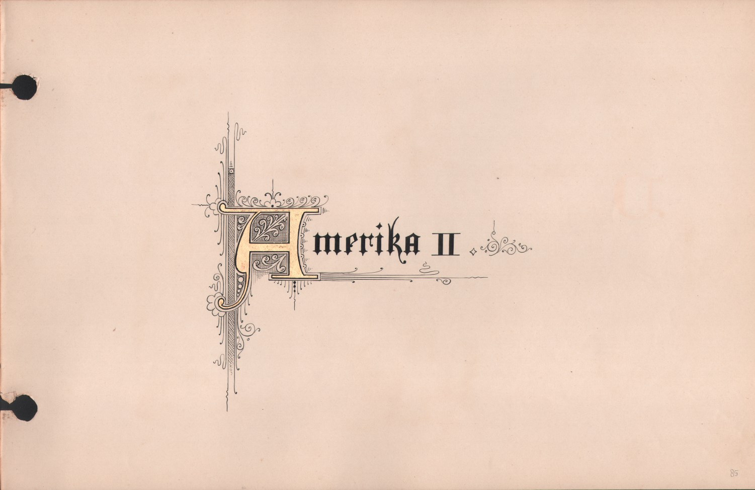 Album met tekeningen stichtingen congregatie van zusters van Liefde aangeboden aan Van Rossum. Band van Indisch weefsel met gouddraad. 1r: blanco 1v: blanco 2r: Blad met rijkversierde letters met de tekst: Aan Zijne Eminentie Kardinaal W.M. van Rossum onzen hoogvereerden Protector op het Gouden Jubelfeest van Zijne Professie in de Congregatie van den Allerheiligsten Verlosser ...