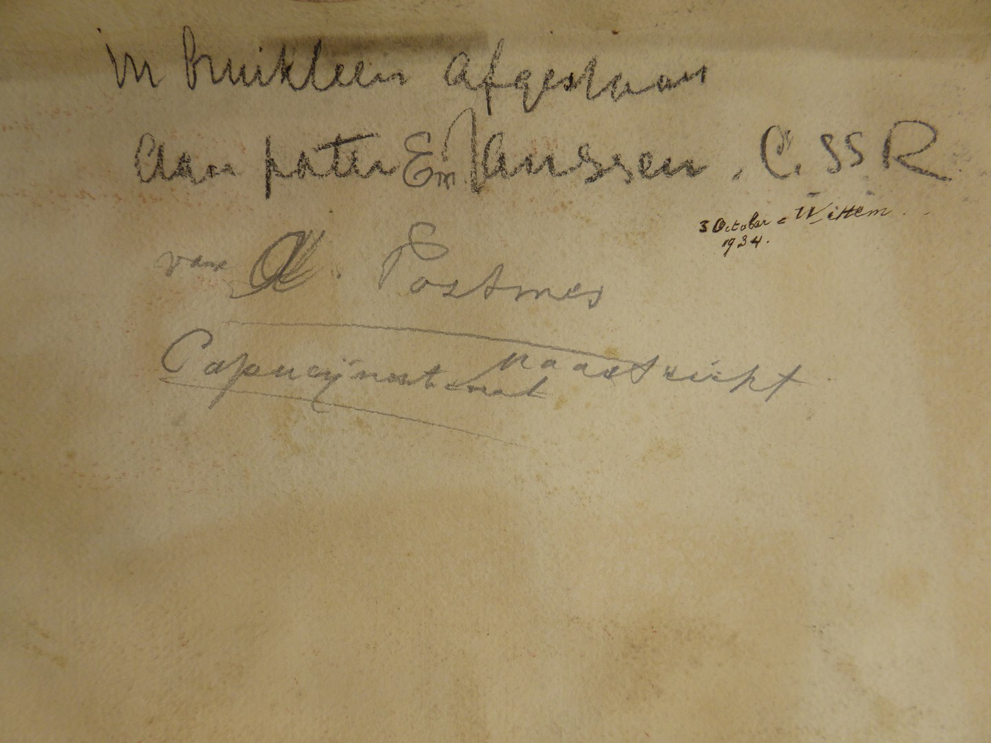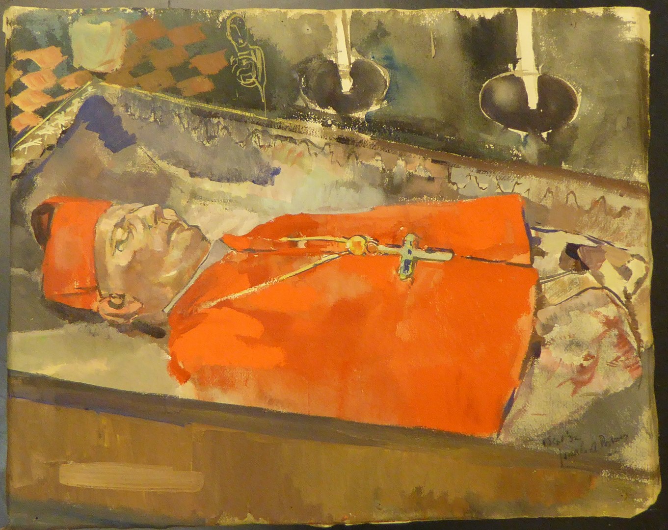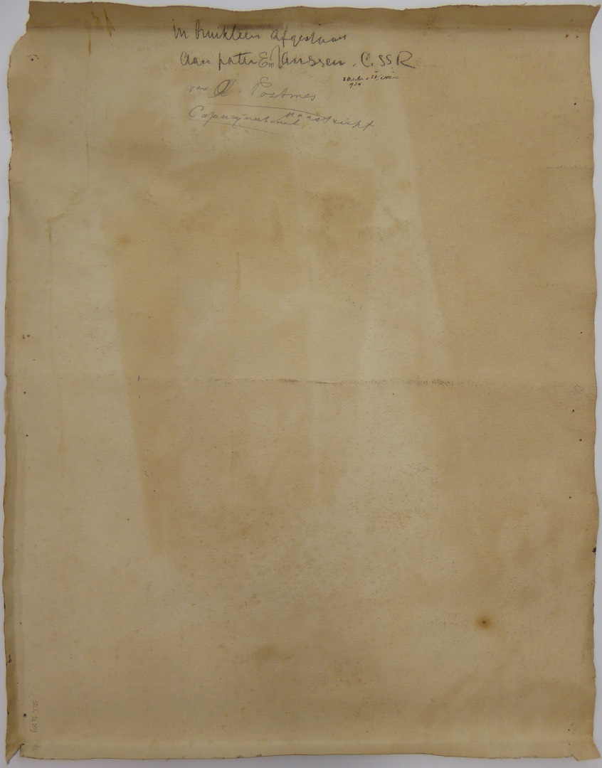Kardinaal van Rossum opgebaard in schoudermantel met borstkruis en bonnet. Rechtsboven ten dele zichtbaar kandelaars en tegelvloer. Gesigneerd en gedateerd: 1 sept. ’32 Josef(?) A. Postmes. Op de achterzijde de tekst: in bruikleen afgestaan aan pater Em. Janssen CSSR 3 October 1934 Wittem van A. Postmes