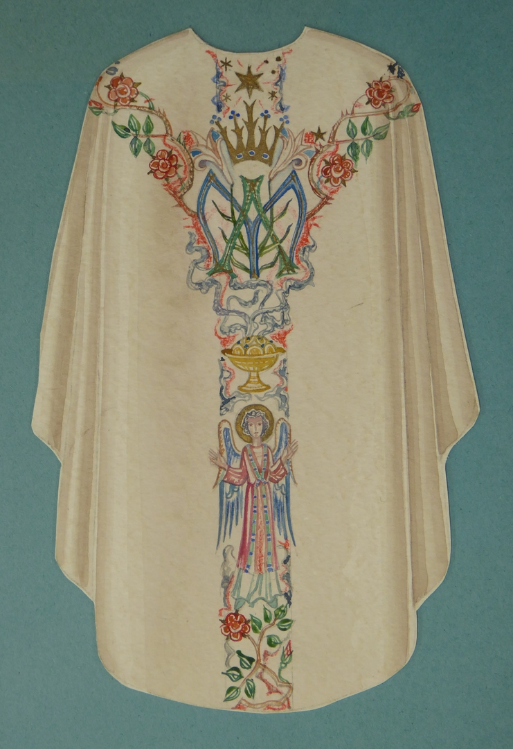 Ontwerp wit kazuifel met Mariamonogram met kroon