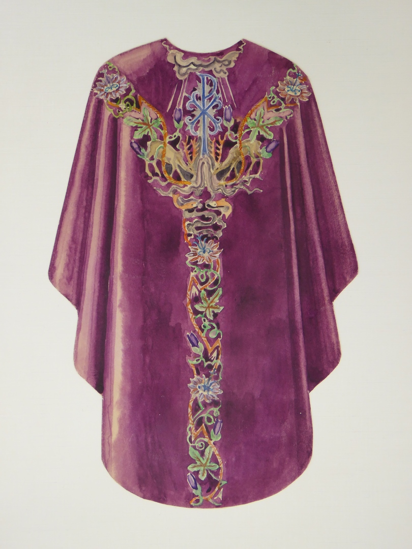 Ontwerp paars kazuifel met herten bij de levensbron en Christusmonogram