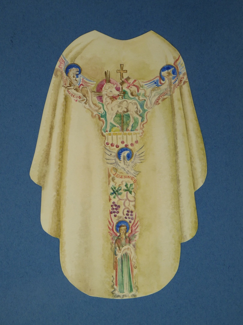 Ontwerp wit kazuifel met het Lams Gods en de symbolen der evangelisten
