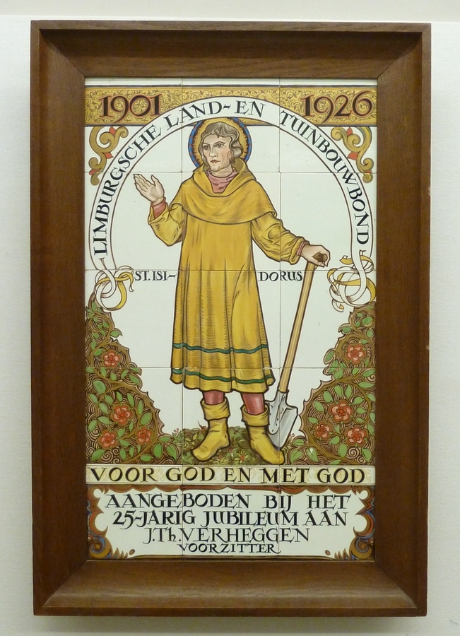 Tegeltableau "Limburgsche land- en tuinbouwbond" met St. Isidorus, met "... aan J.Th. Verheggen"