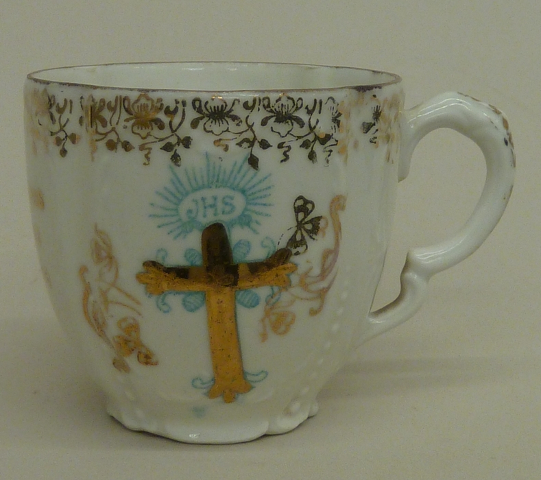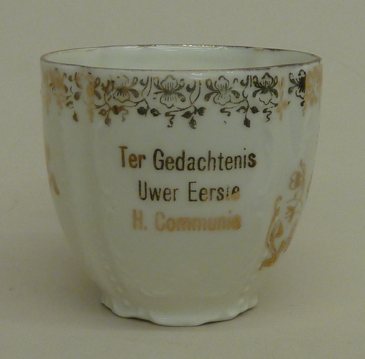 Kopje met "Ter Gedachtenis Uwer Eerste H. Communie" met goudkleurig kruis en IHS in blauw