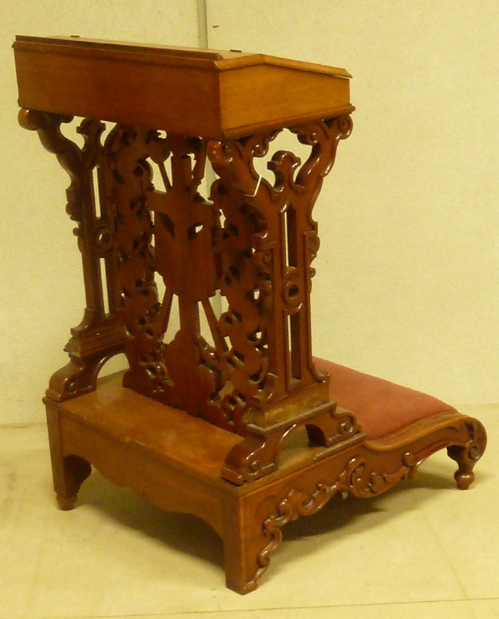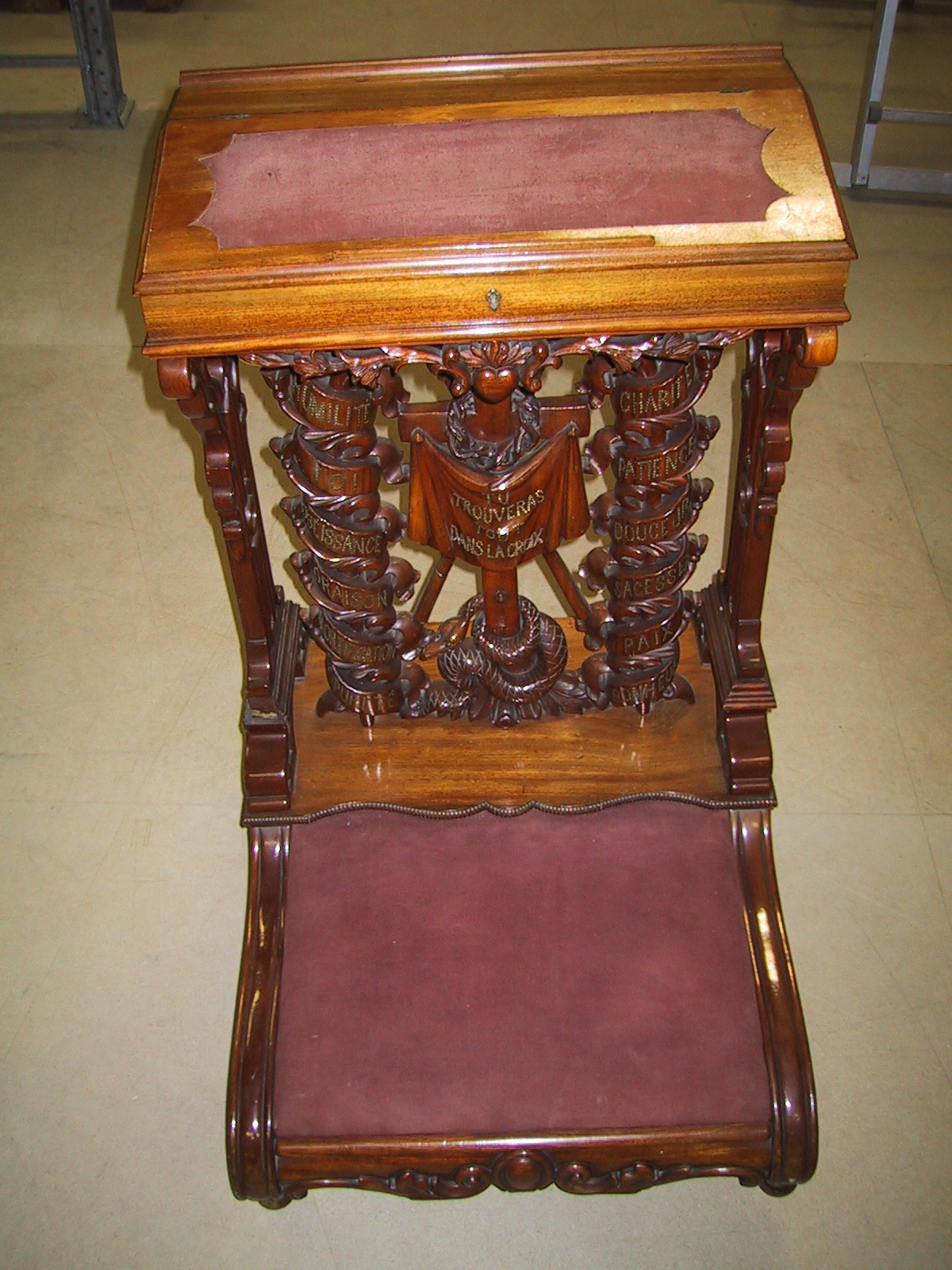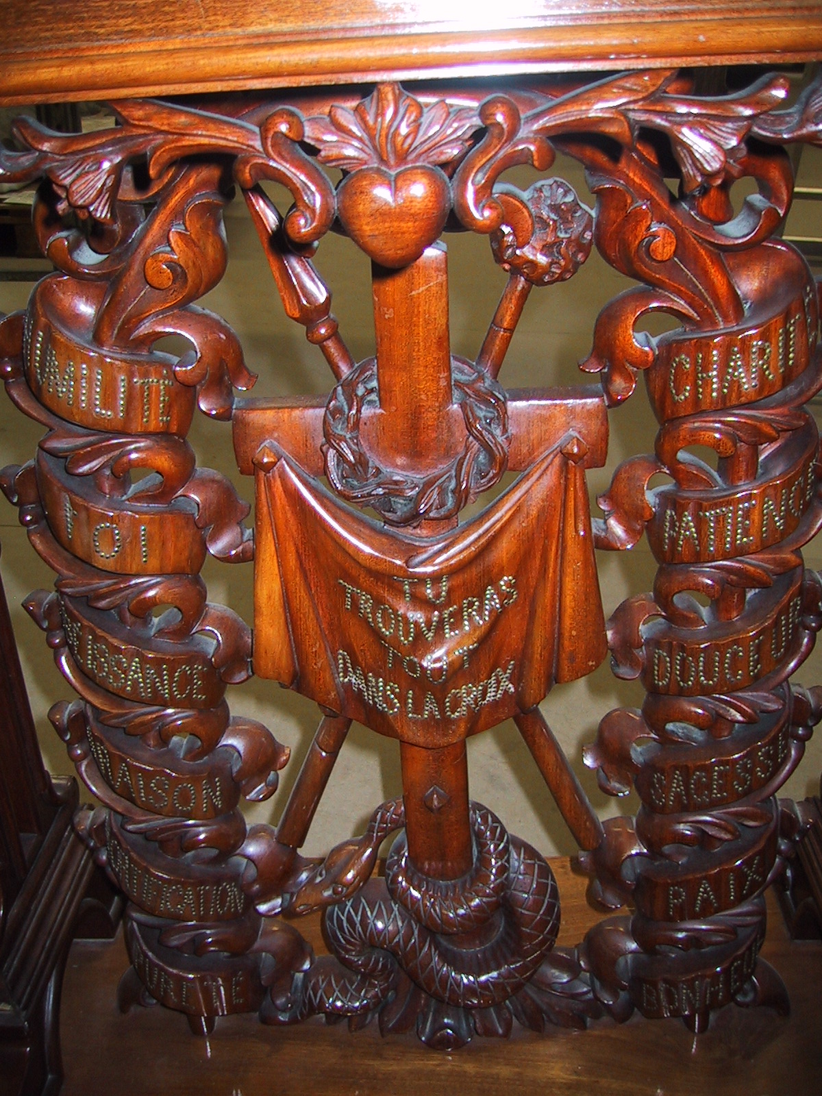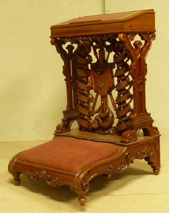 Bidstoel met klep, houtsnijwerk met kruis, Arma Christi, slang en kolommen met Franse tekst