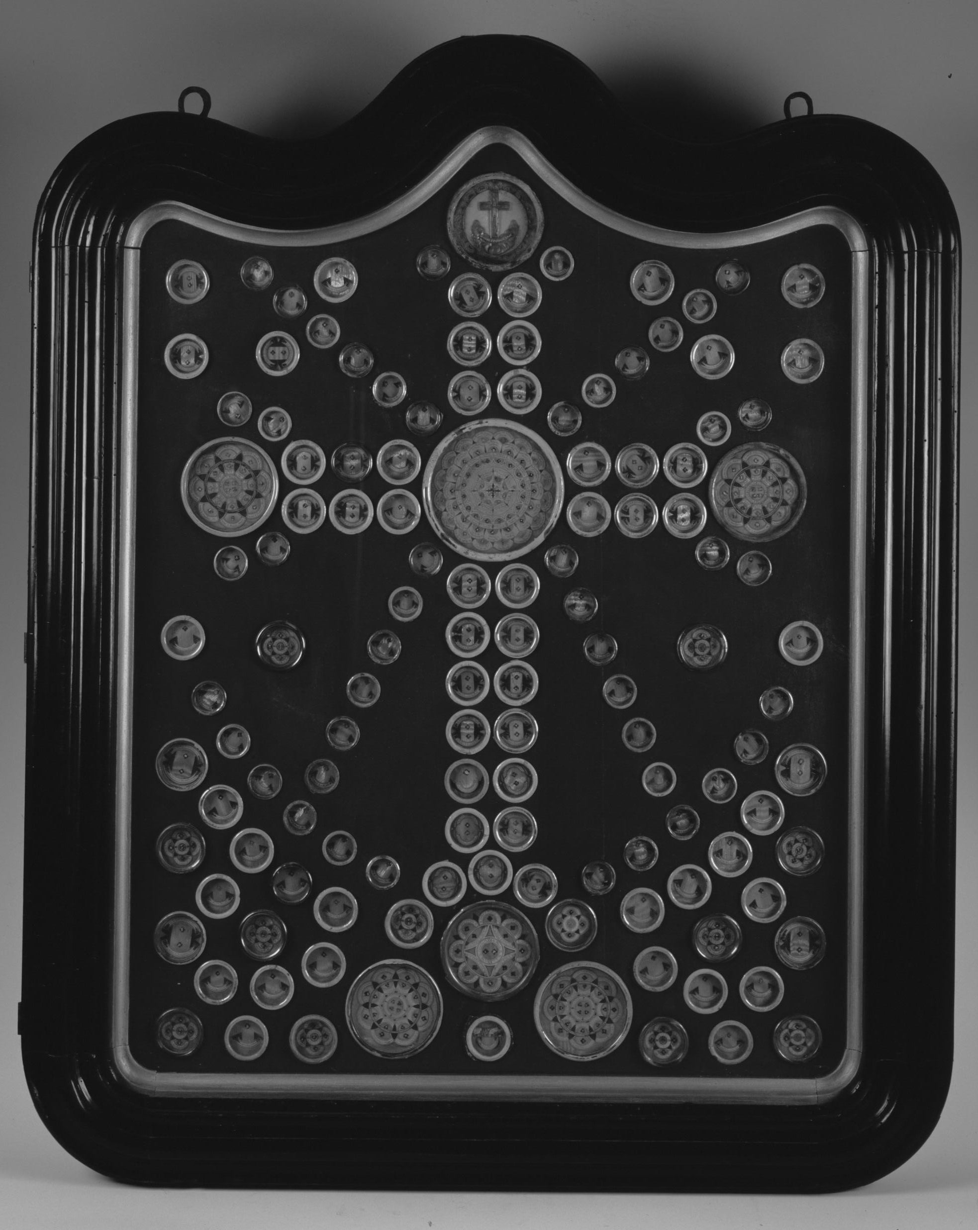 Reliekkast met 131 reliekmedaillons op rode achtergrond