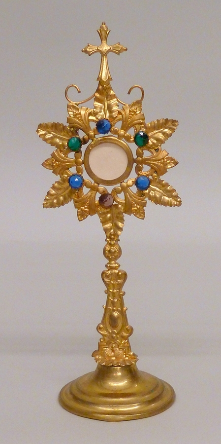 Goudkleurige speelgoedmonstrans met rond de hostie zes gekleurde 'steentjes' en zes bladeren