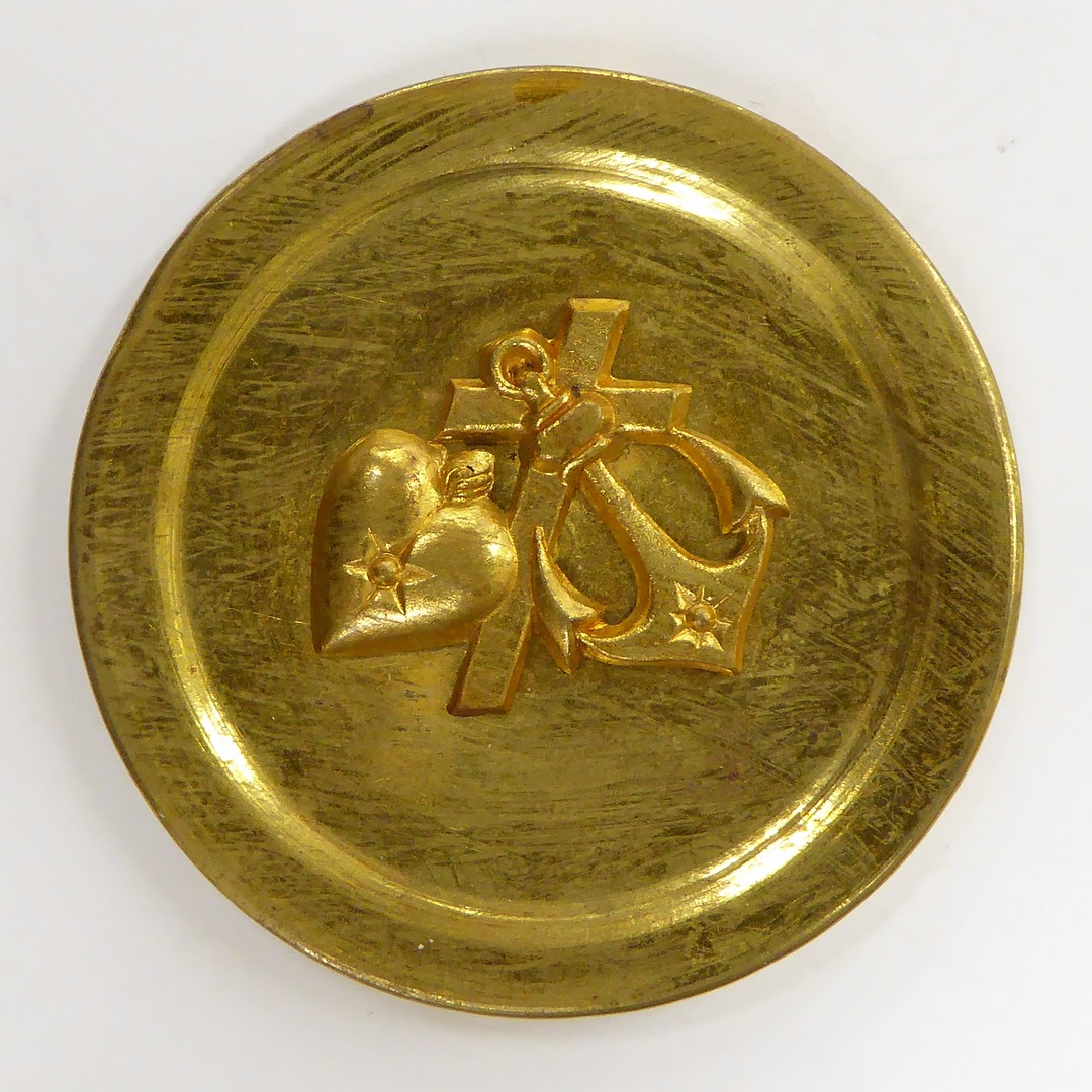 Goudkleurige speelgoedpateen met geloof, hoop en liefde, in vorm van deksel