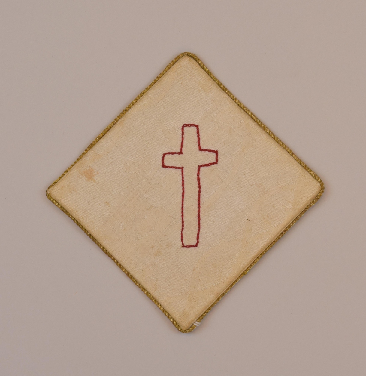 Witte speelgoedpalla met diagonaal geborduurd kruis