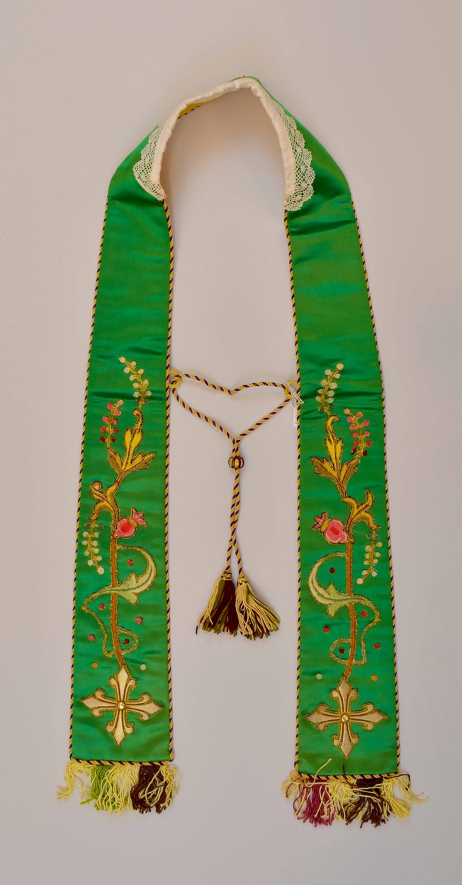Groene kinderpreekstola met koord en op uiteinden kruis uitlopend in bloem