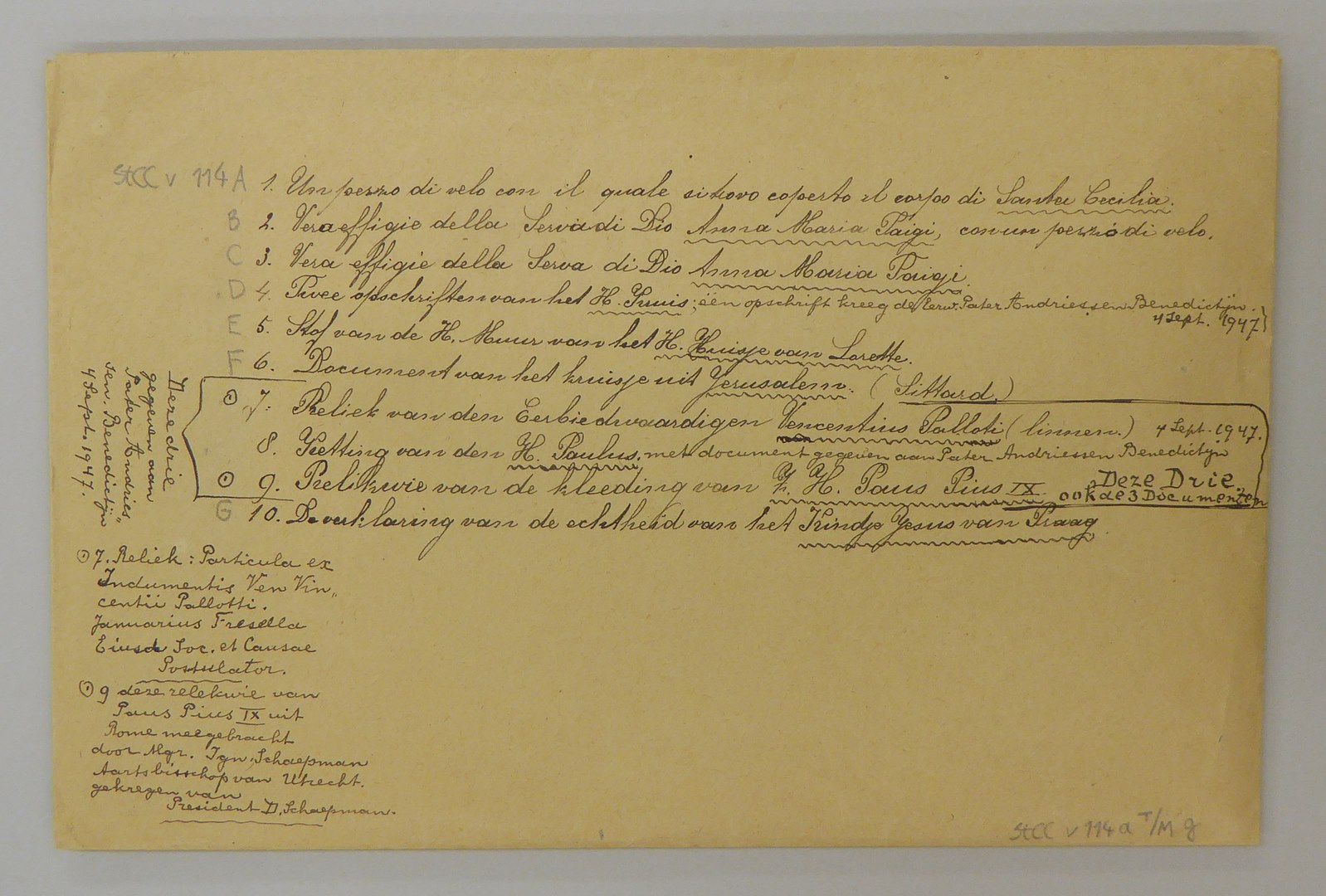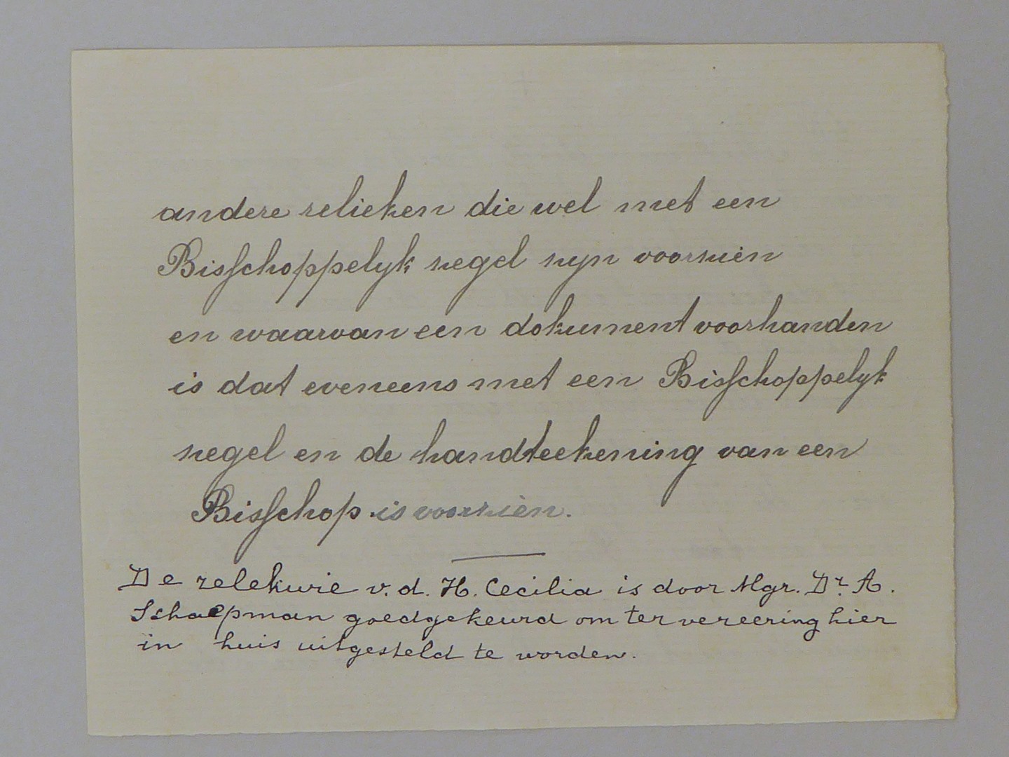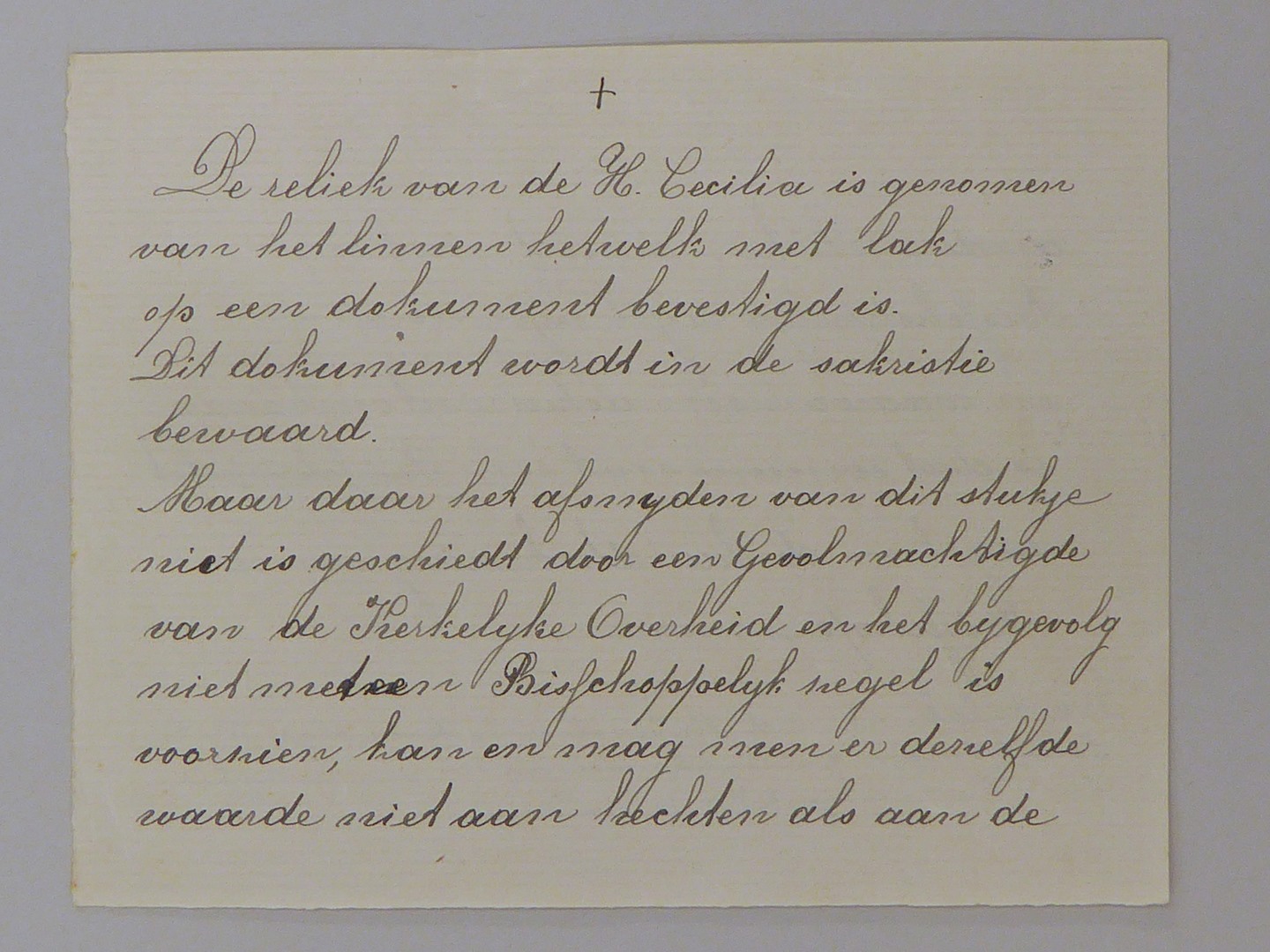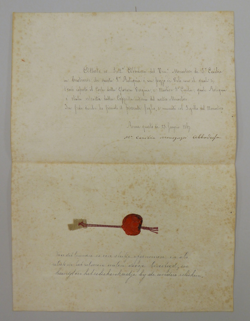 Stofreliek van H. Cecilia, genaaid op papier met "Attesto io ... andere relieken"