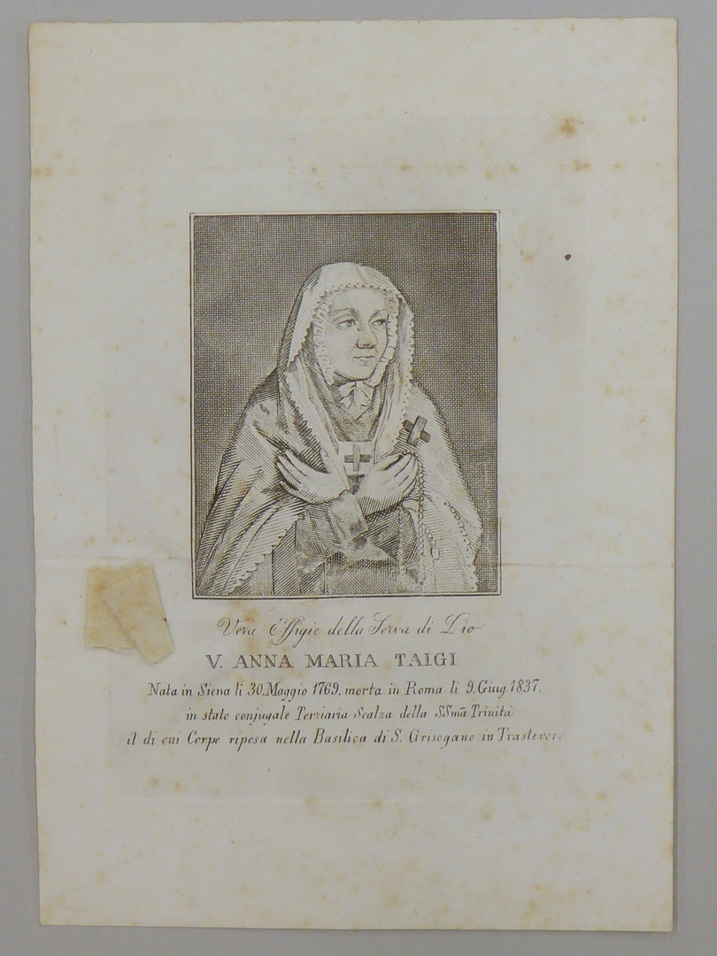 Stofreliek van Anna Maria Taigi (1769-1837), genaaid op papier met haar beeltenis