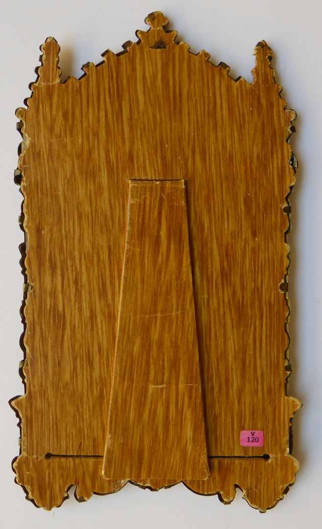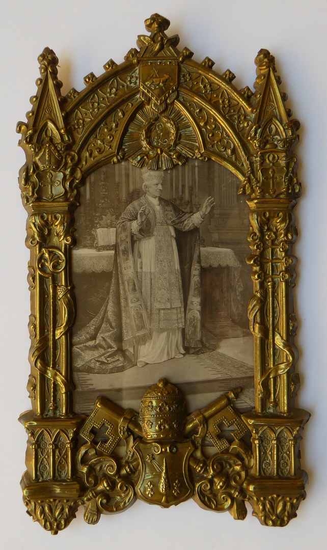 Lijstje van koperblik versierd met wapen paus Leo XIII en letter "L", waarin afbeelding van Leo XIII