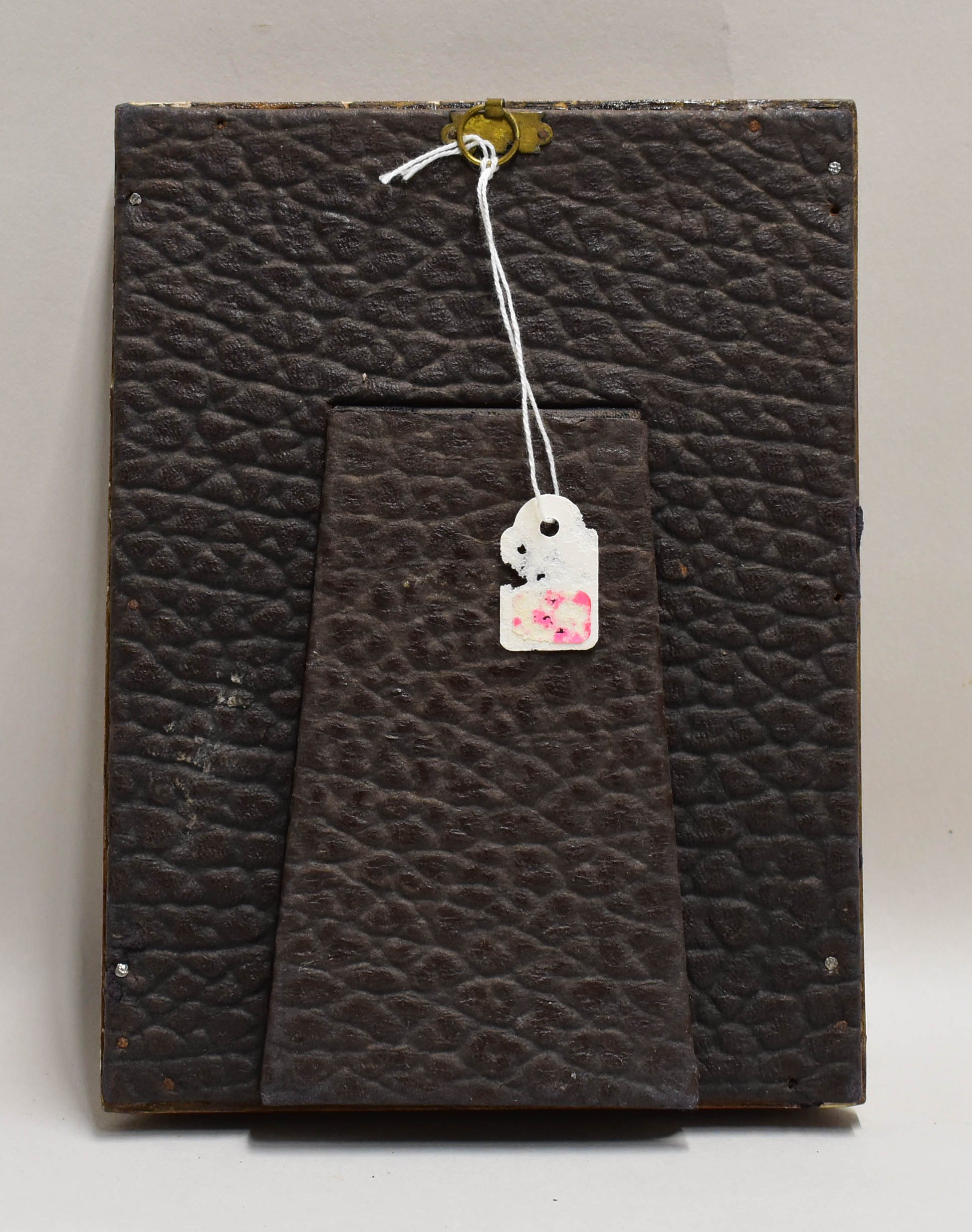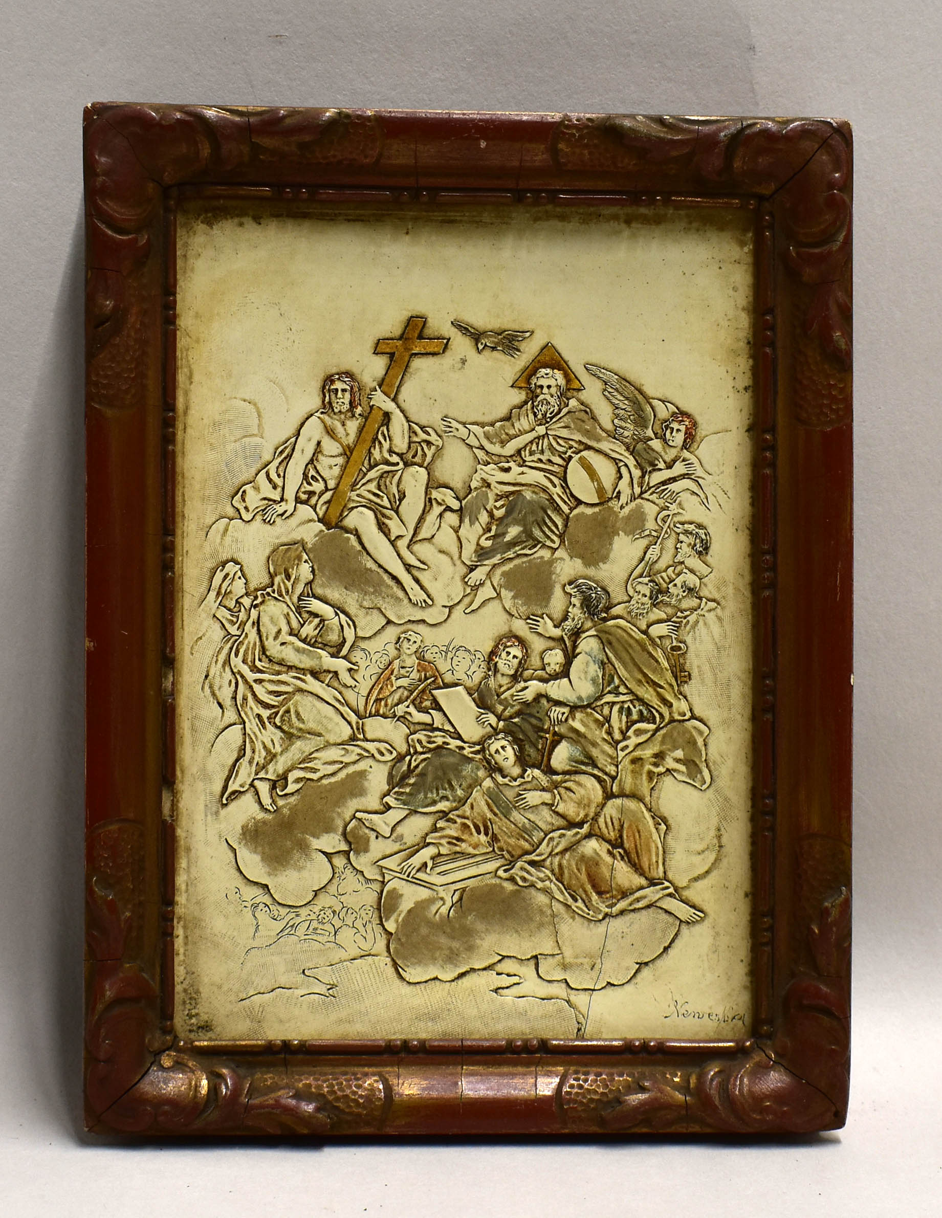 Afbeelding van H. Drievuldigheid en evangelisten in persdrukwerk, in houten lijstje