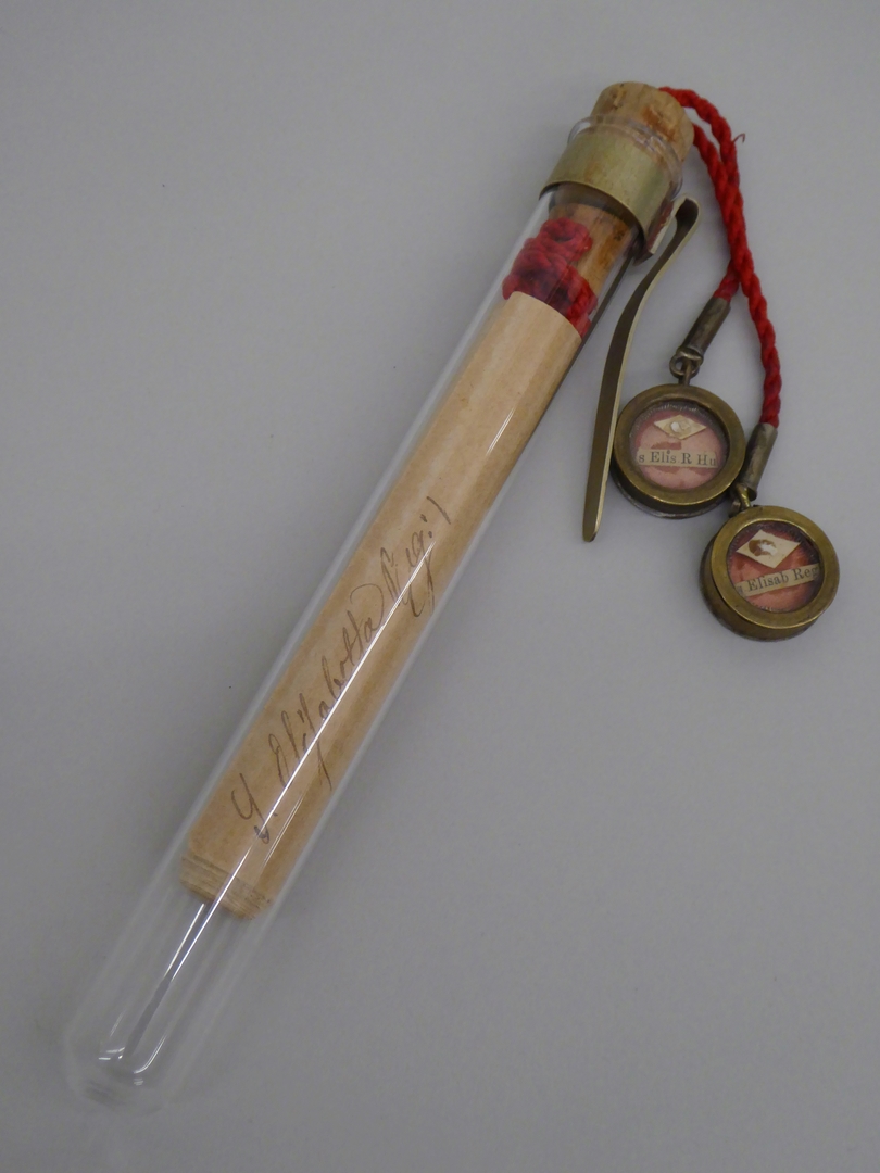 Twee relieken van H. Elisabeth met rood koord verbonden aan reageerbuis met StCC v124b