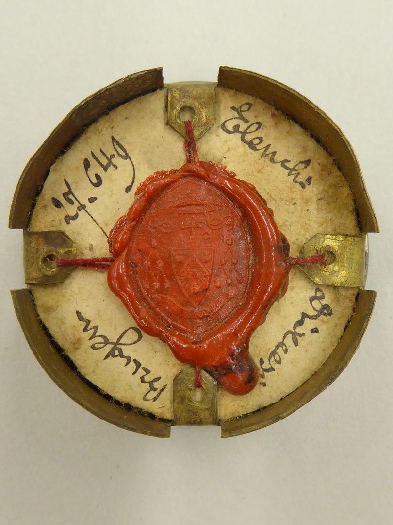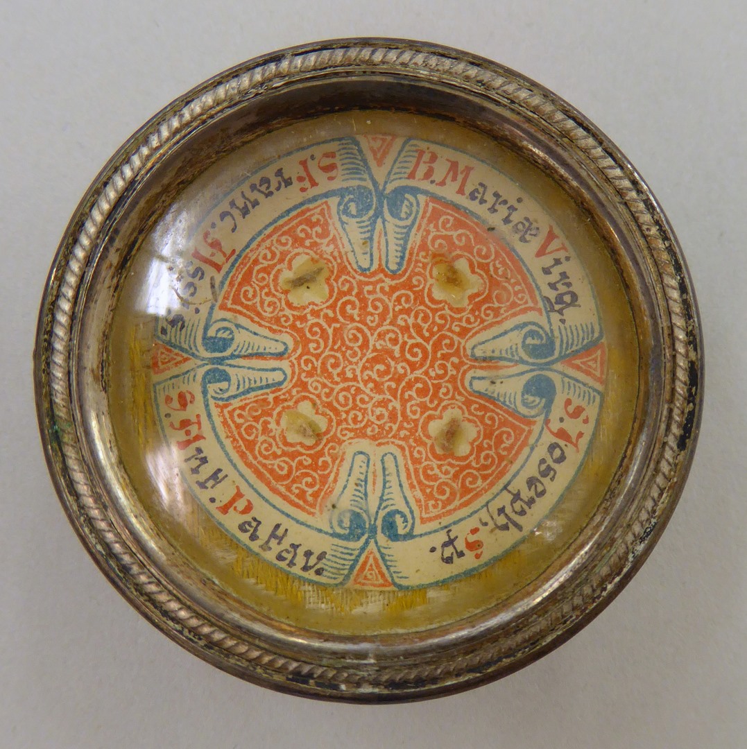 Reliekmedaillon met relieken van HH. Maria, Jozef, Franciscus van Assisië en Antonius van Padua