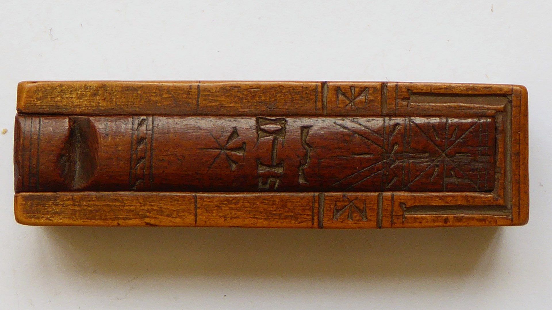 Zakheiligdom in vorm van doosje met schuifdeksel met IHS waarin gekruisigde Christus