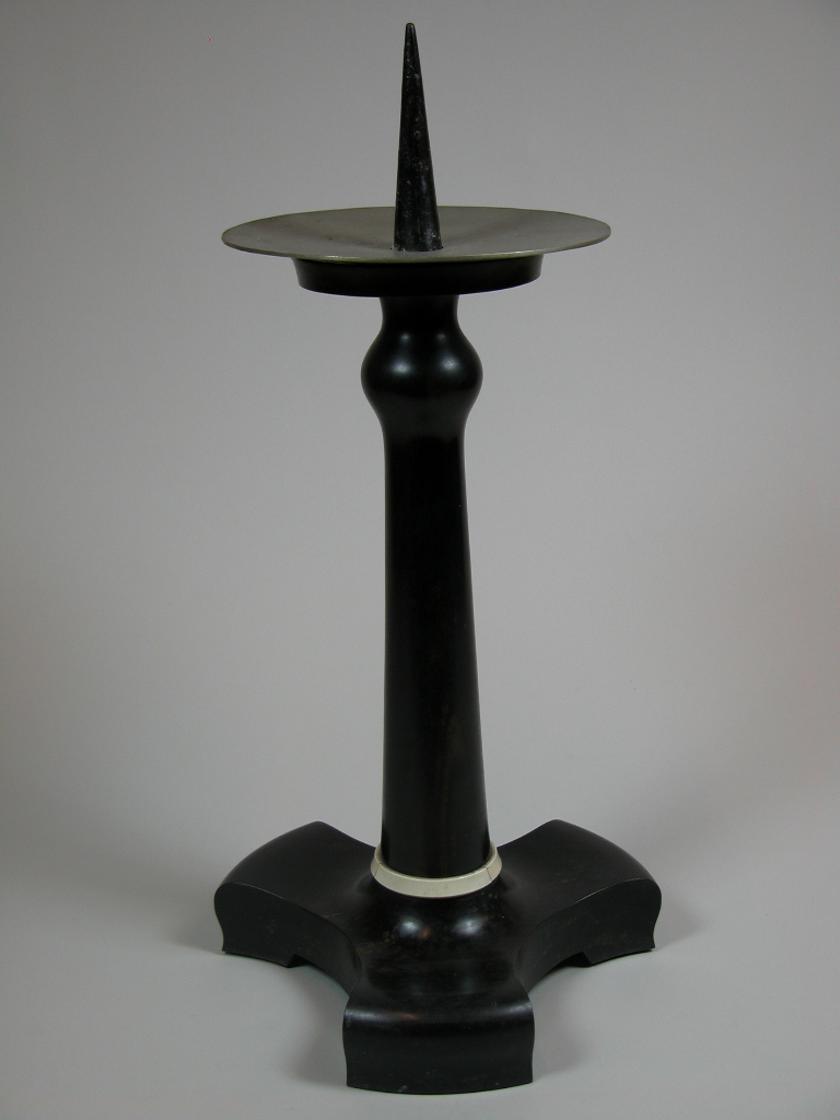 Houten kandelaar op ingezwenkte driepoot met ivoren ring, met metalen vetvanger