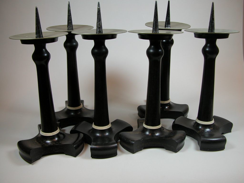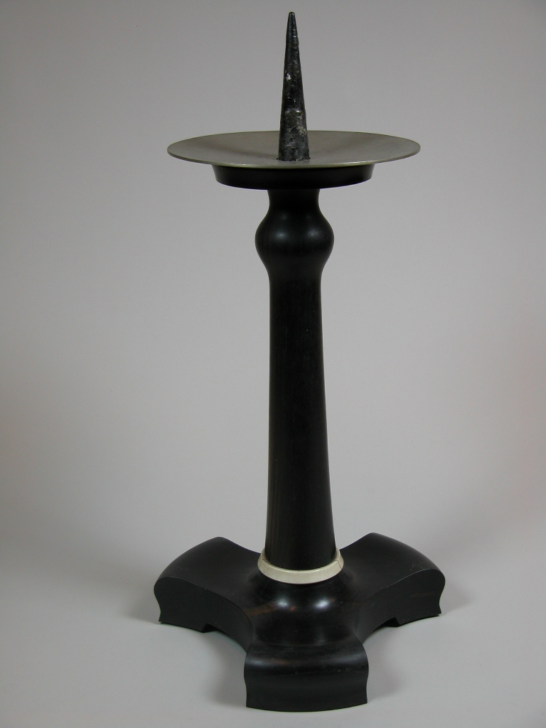 Houten kandelaar op ingezwenkte driepoot met ivoren ring, met metalen vetvanger