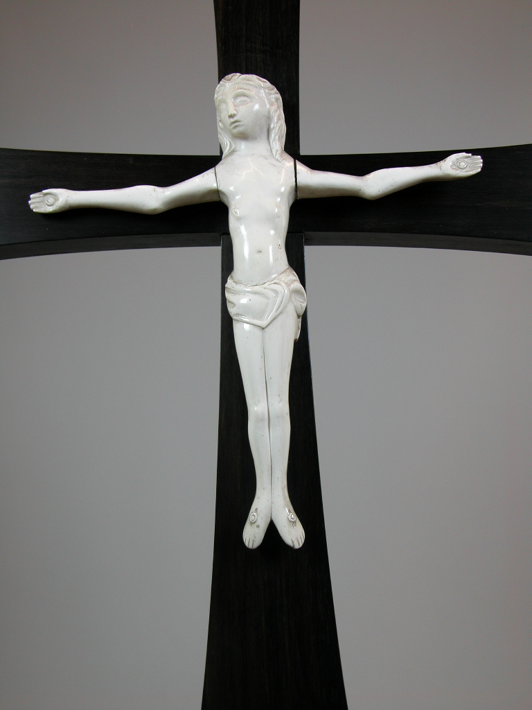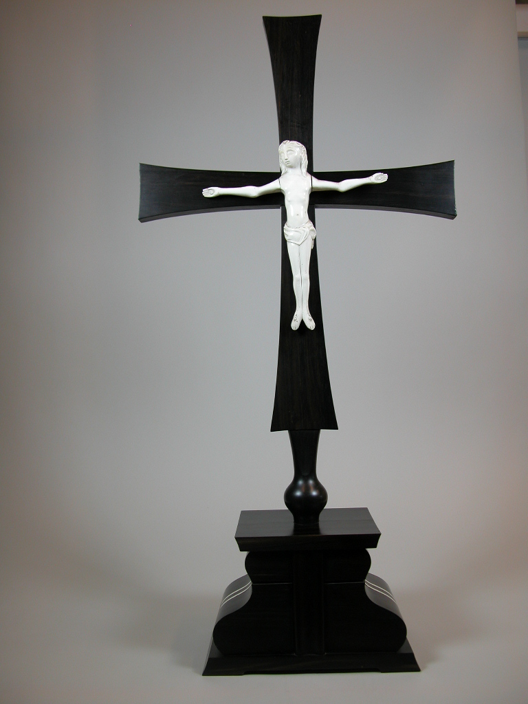 Altaarkruis van ebbenhout met ivoren corpus en ivoren inzetstukjes aan beide zijkanten van de sokkel