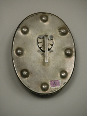 Koorkapsluiting ingelegd met ivoren ovale afbeelding van Christus als Salvator Mundi, omgeven door zilverrand, ingelegd met carneolen kralen