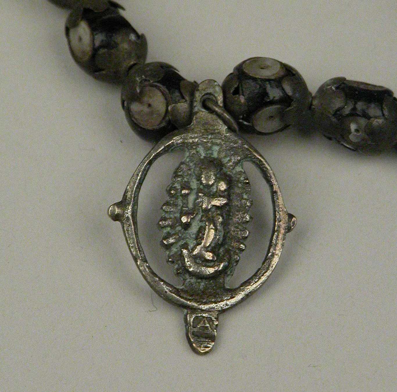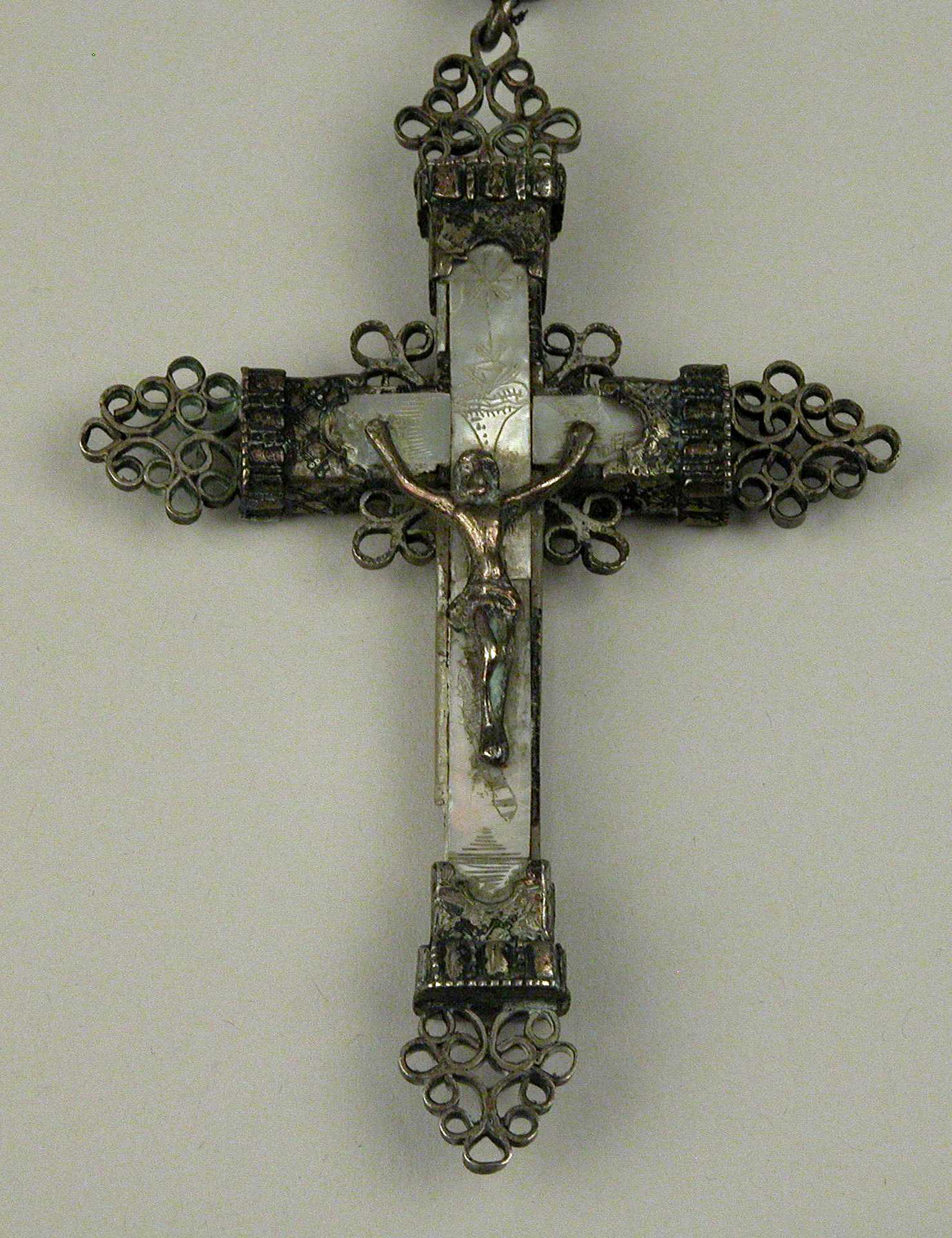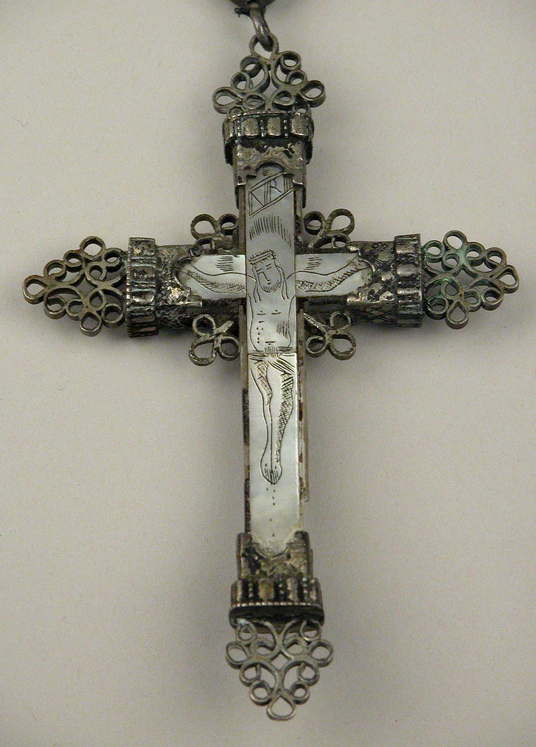 Rozenkrans met kruisbeeld met filigraanwerk aan uiteinden en met hangertje waarop Maria op maansikkel in stralenkrans