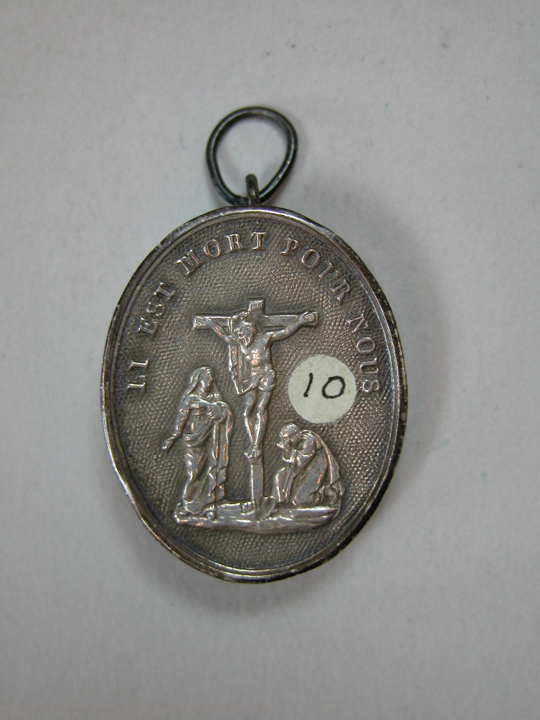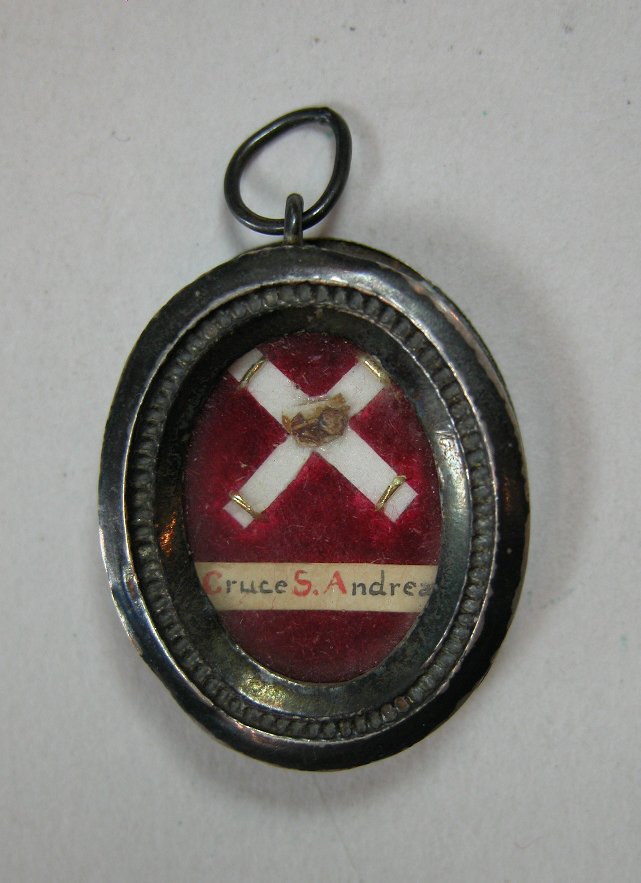 Reliekmedaillon met reliek van het kruishout van H. apostel Andreas, op achterkant medaillon Calvarieberg met daaronder "Il est mort pour nous"