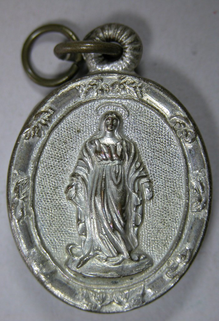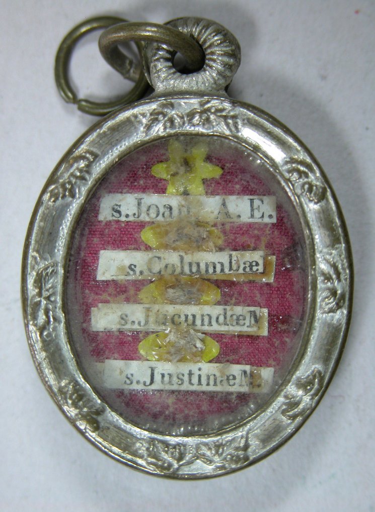 Reliekmedaillon met relieken ex domo H. Johannes apostel en evangelist en ex oss. H. Columba, H. Jucunda martelares en H. Justina martelares, op de achterzijde voorstelling van de Onbevlekte Ontvangenis