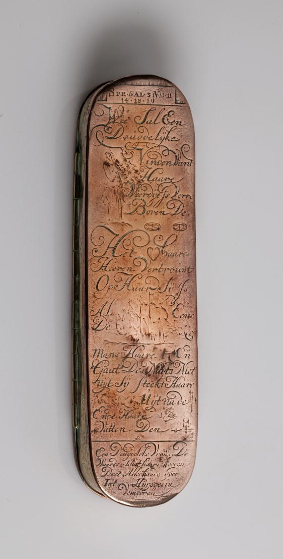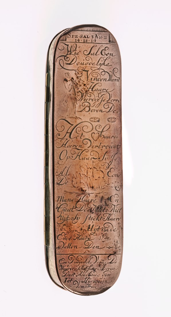 De tekst op deze tabaksdoos is afkomstig van de Kleine Print-Bybel, Gerrit Bouman, 1736 Wie Sal Een Deugdelijke [Huisvrouw] Vinden Want Haare Weerdye Is Verre Boven De [Robijnen] Het [Hart] Haares Heeren Vertrouwt Op Haar Sij Is Als De [Schepen] Eens Koopmans Haare [Lamp] En Gaat Des Nagts Niet Uijt Sij Steekt Haare [Handen] Uijt ...