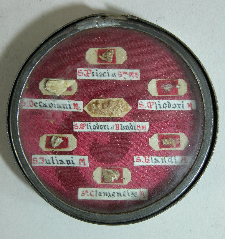 Reliekmedaillon met relieken ex oss. H. Prisca, H. Octavianus, H. Julianus, H. Clemens, H. Heliodorus en H. Blandina