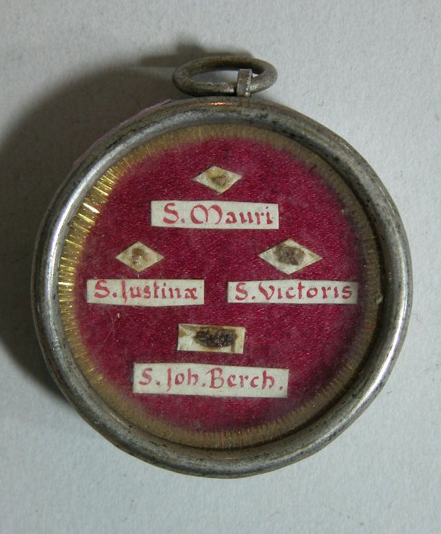Reliekmedaillon met relieken ex oss. H. Maurus, H. Justinus, H. Victor en H. Johannes Berchmans