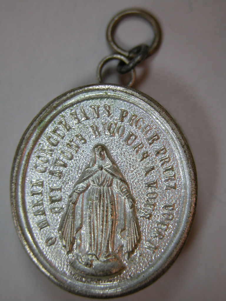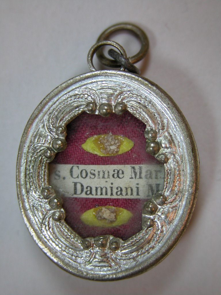 Reliekmedaillon met reliek ex oss. H. Cosmas en H. Damianus, op achterkant afbeelding van Onbevlekte Ontvangenis van Maria