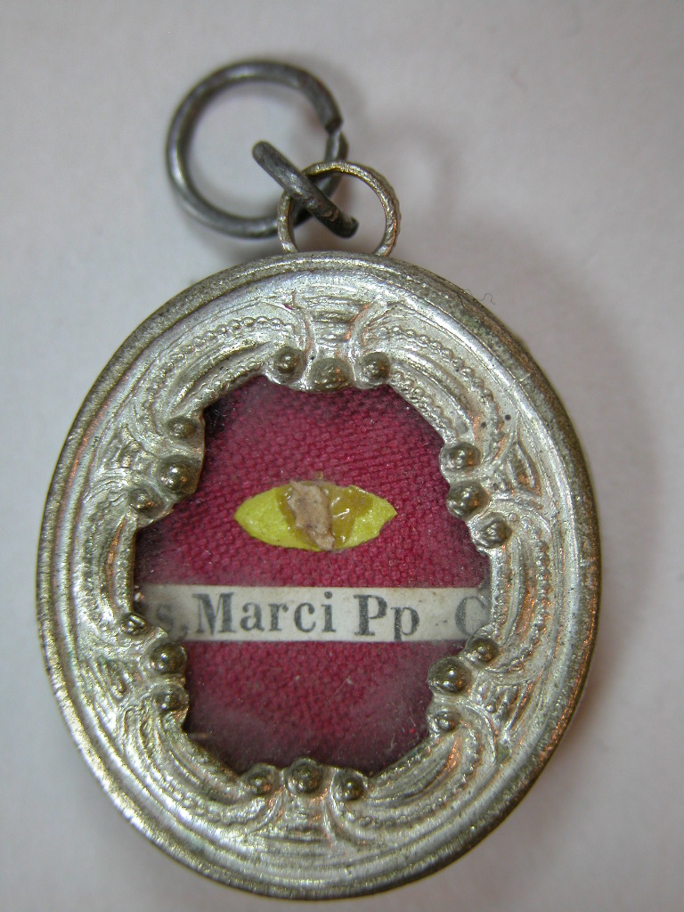 Reliekmedaillon met reliek ex oss. H. paus Marcus, op achterzijde afbeelding van de Onbevlekte Ontvangenis van Maria