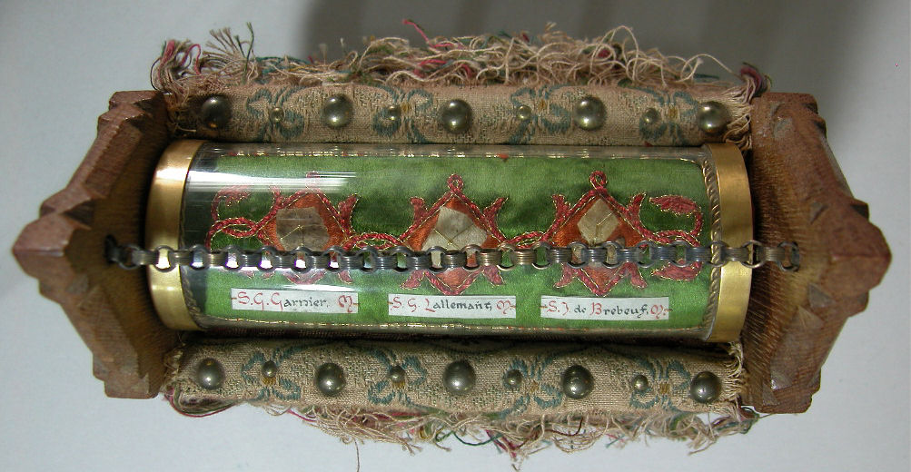 Houten reliekhouder met daarin een glazen cilinder met drie relieken van drie Canadese martelaren (1649): H. Carolus Garnier, H. Gabriël Lalemant en H. Johannes de Brébeuf