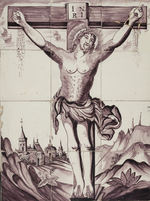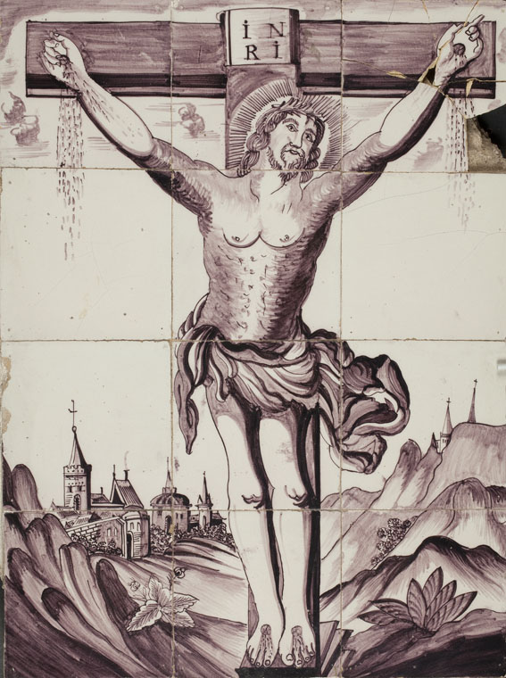 Tegeltableau (paars), 12 tegels met gekruisigde Christus, achtergrond met heuvels