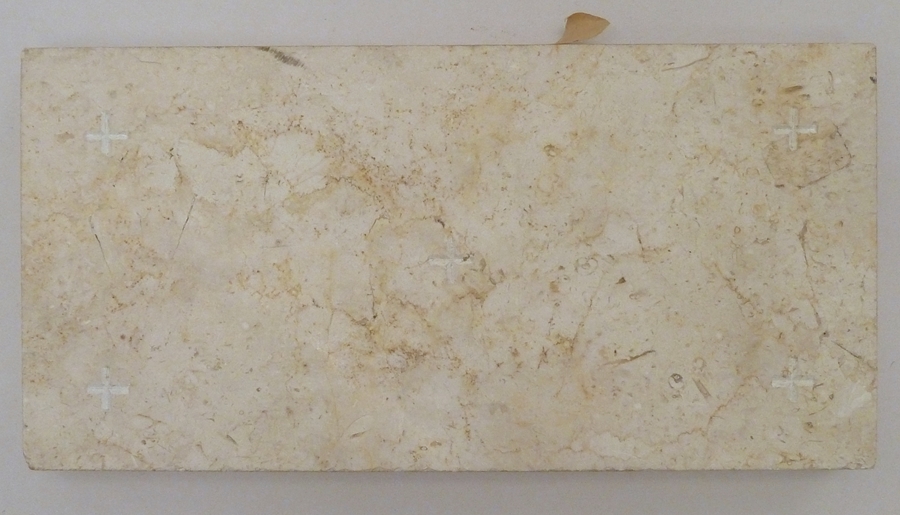 Altaarsteen met "Sepulcrum Sanctorum Martyrum Modesti et Victoris" op de zijkant geplakt