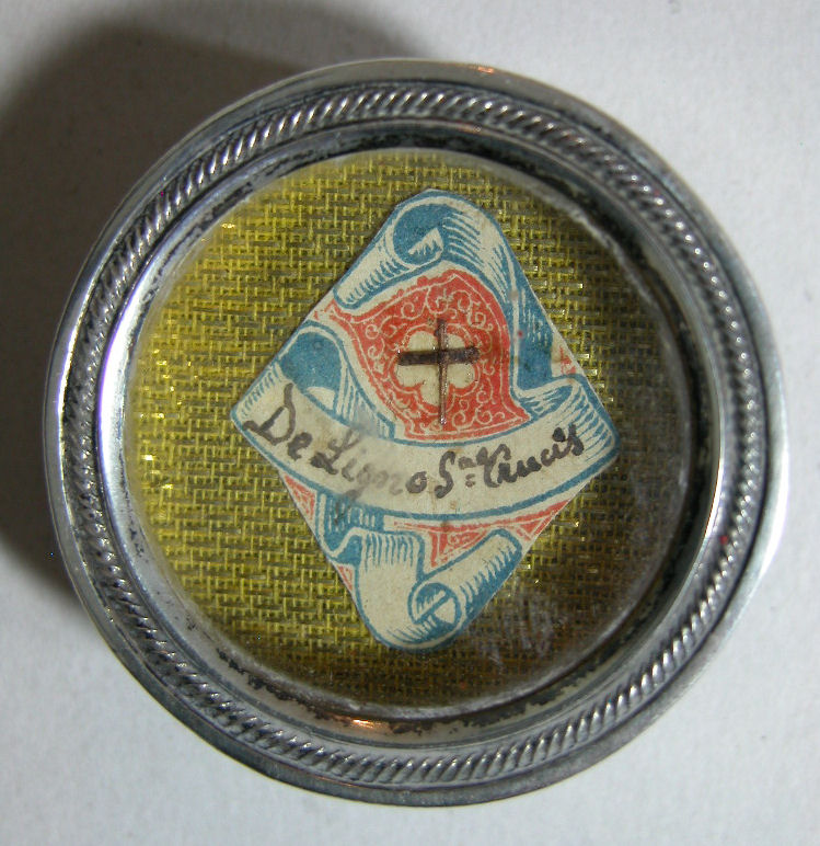 Reliekmedaillon met reliek van het Kruis van Christus, aan de achterkant van de medaillon een ring, met in het medaillon "De Ligoro SS Crucis"