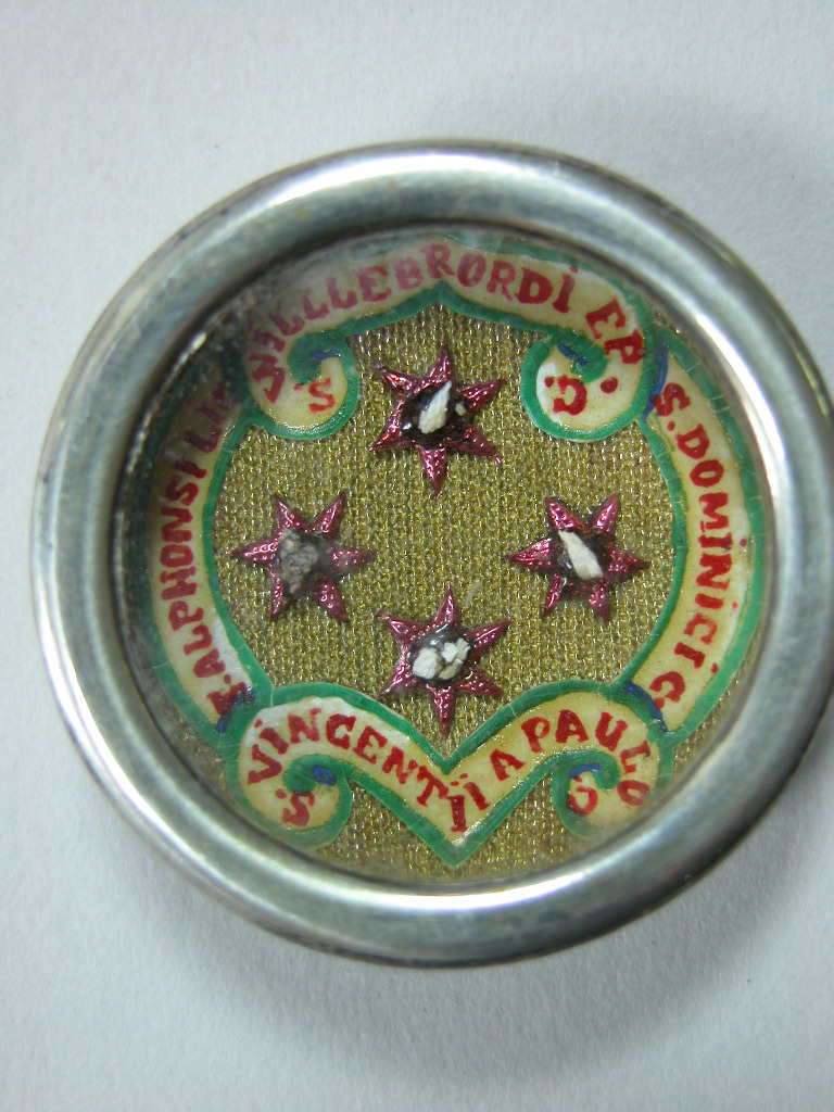 Reliekmedaillon met relieken ex oss. HH. Willibrordus, Dominicus, Vincentius a Paolo en Alphonsus de Liguori