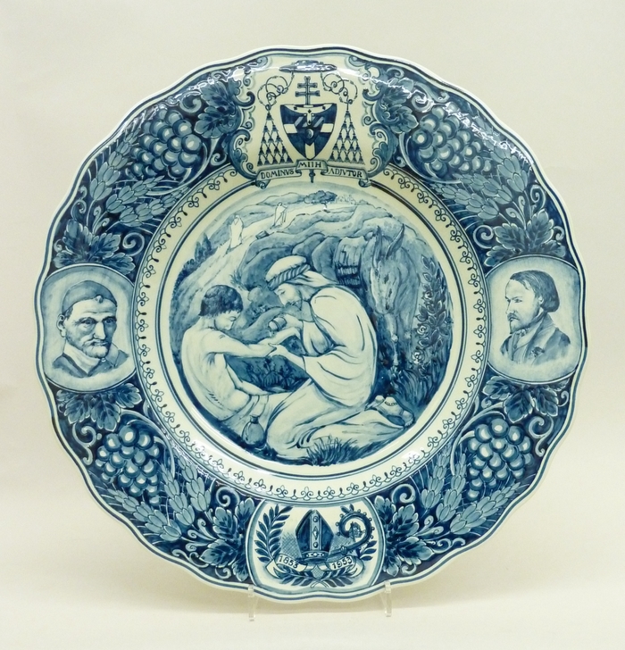 Plateelbord met barmhartige Samaritaan, wapen van kardinaal Johannes de Jong, St. Vincentiusvereniging