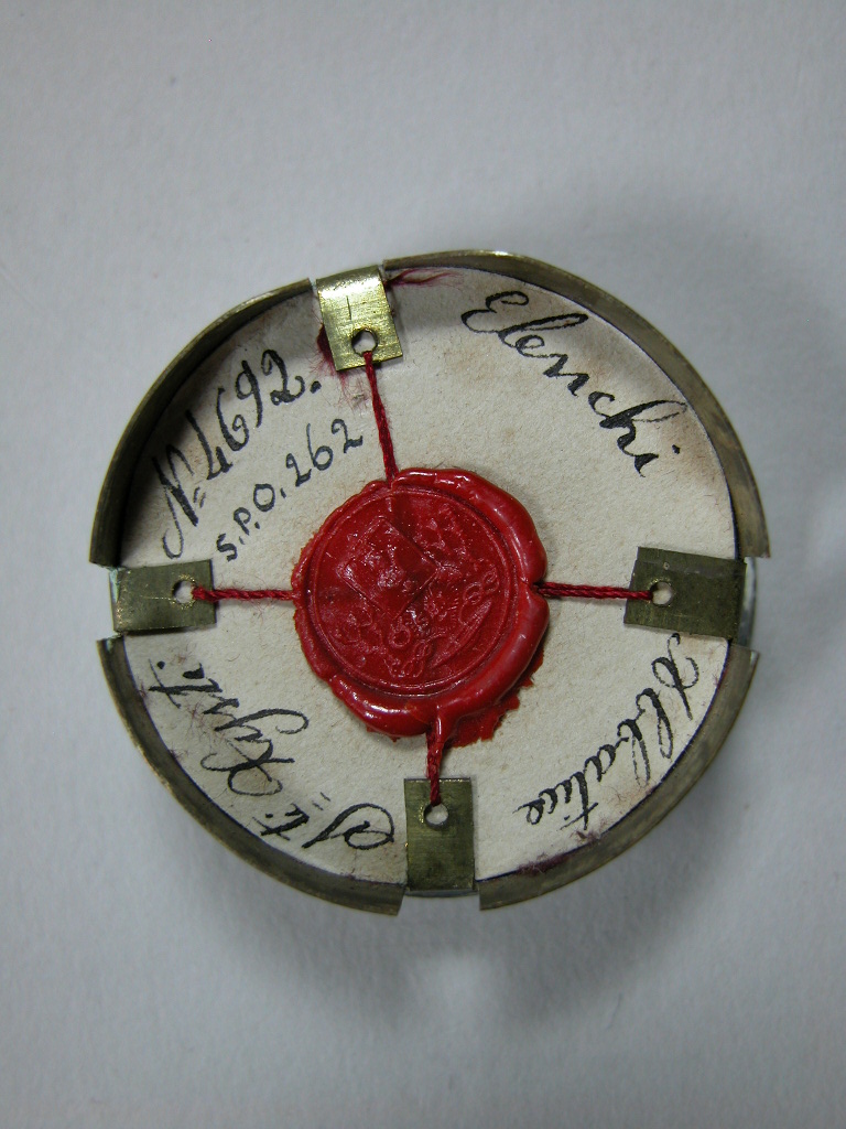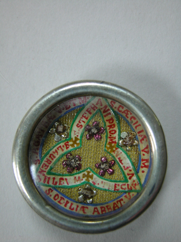 Reliekmedaillon met relieken ex oss. HH. Stephanus, Laurentius, Thecla, Agatha, Cecilia en Odilia