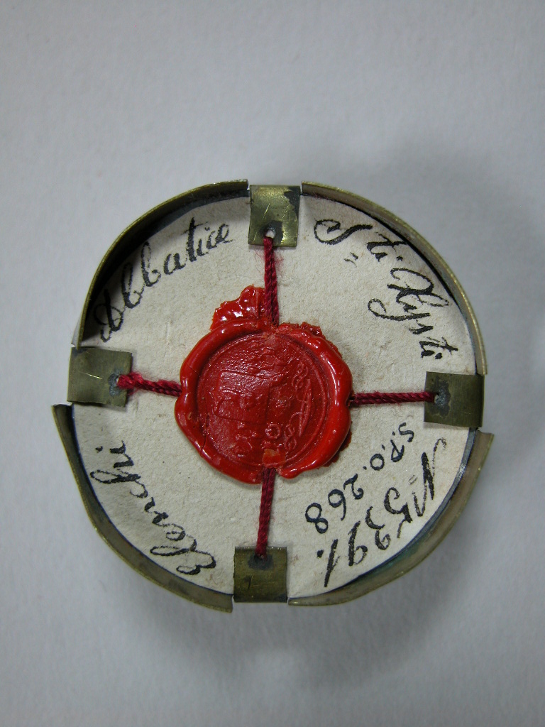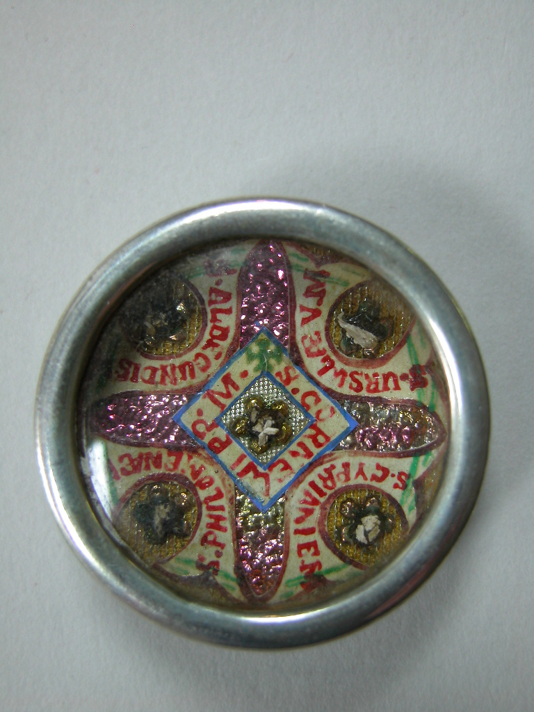 Reliekmedaillon met relieken ex oss. HH. paus Cornelius, Cyprianus, Philomena, Ursula en Aldegonda