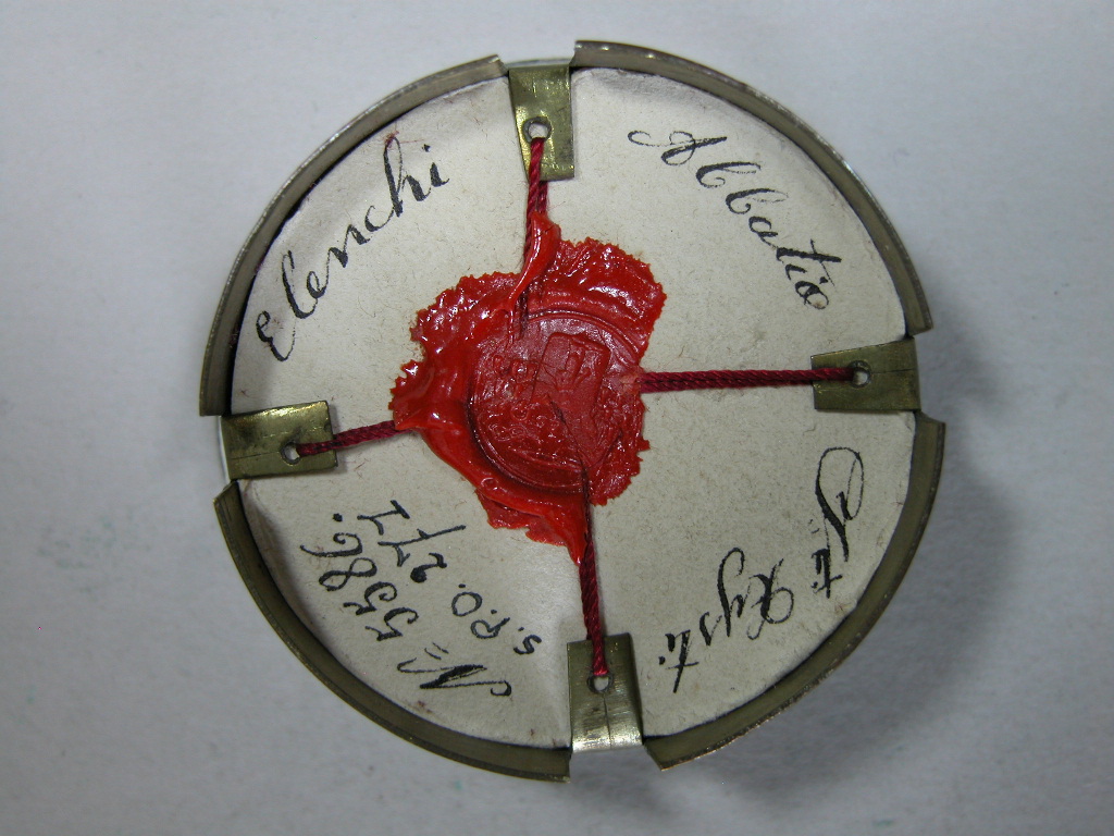 Reliekmedaillon met relieken ex oss. HH. Cornelius, Januarius, Franciscus van Sales, Hubertus, Maria Magdalena, Margaretha Alacoque en ex veste H. Margaretha van Cortona en H. Johanna de Chantal