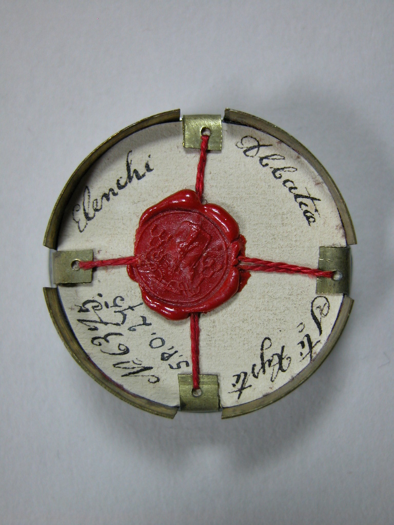 Reliekmedaillon met relieken ex tunica H. Bernardus van Siena, ex stipite H. Johannes van Britto, ex ossibus HH. Hermanus Joseph, Cecilia, Brigitta, Elisabeth van Hongarije